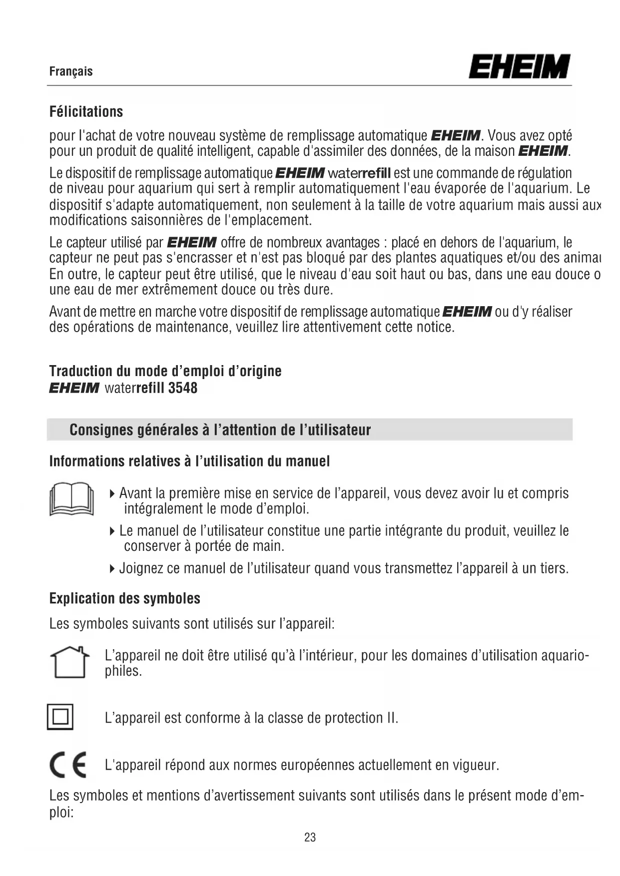 Consignes générales à l’attention de l’utilisateur Informations relatives à l’utilisation du manuel 4 Avant la première mise en service de l’appareil, vous devez avoir lu et compris intégralement le mode d’emploi. 4 Le manuel de l’utilisateur constitue une partie intégrante du produit, veuillez le conserver à portée de main. 4 Joignez ce manuel de l’utilisateur quand vous transmettez l’appareil à un tiers. Explication des symboles Les symboles suivants sont utilisés sur l’appareil: L’appareil ne doit être utilisé qu’à l’intérieur, pour les domaines d’utilisation aquario- philes. L’appareil est conforme à la classe de protection II. L'appareil répond aux normes européennes actuellement en vigueur. Les symboles et mentions d’avertissement suivants sont utilisés dans le présent mode d’em- ploi: Traduction du mode d’emploi d’origine EHEIM waterrefill 3548 FrançaisDANGER! Ce symbole indique qu’il existe un risque d’électrocution pouvant avoir pour consé- quence la mort ou des blessures corporelles graves. DANGER! Ce symbole indique qu’il existe un risque pouvant avoir pour conséquence la mort ou des blessures corporelles graves. AVERTISSEMENT! Ce symbole indique qu’il existe un risque pouvant avoir pour conséquence des blessures corporelles moyennes à légères, ou bien des conséquences pour la santé. ATTENTION! Ce symbole indique un risque de dégâts matériels. Conseils et informations utiles. Convention de présentation: A Renvoi à une illustration, ici à la figure A. Vous êtes invité(e) à exécuter une action. Domaine d’application L’appareil et toutes les pièces fournies sont destinés à être utilisés dans le domaine privé et ils ont été conçus exclusivement :