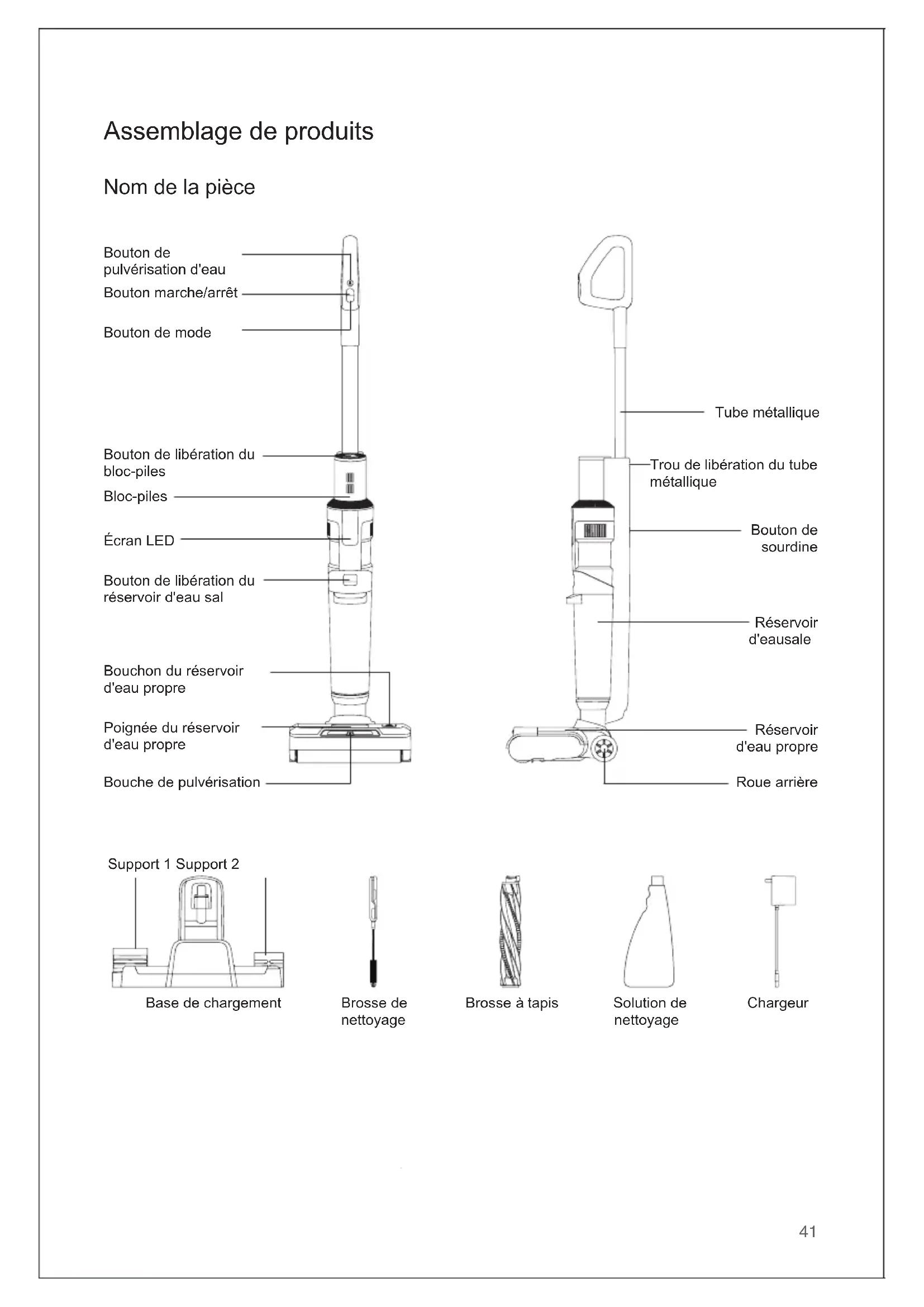 consulter un médecin à temps.52 Problème Cause possible Solution Ne peut pas démarrer ou s'arrêter pendant l'utilisation Batterie faible Recharge de la batterie Le bouton marche/arrêt n'est pas enfoncé Appuyez sur le bouton marche/arrêt La brosse est emmêlée Nettoyer la brosse Réservoir d'eau sale plein Nettoyer le réservoir d'eau sale Le bloc-piles n'est pas assemblé correctement Remontez le bloc-piles Entrée d'aspiration bloquée Nettoyer l'entrée d'aspiration et le ltre Faible aspiration Entrée d'aspiration bloquée Nettoyer l'entrée d'aspiration et le ltre Pas de HEPA assemblé Assembler le HEPA Bruit anormal Entrée d'aspiration bloquée Nettoyer l'entrée d'aspiration et le ltre Pas de HEPA assemblé Assembler le HEPA La bouche de pulvérisation ne pulvérise pas l'eau Réservoir d'eau propre vide Remplir le réservoir d'eau propre Le bouton de pulvérisation d'eau n'est pas enfoncé Appuyez sur le bouton de pulvérisation d'eau Le réservoir d'eau propre n'est pas assemblé correctement Remonter le réservoir d'eau propre Vaporisation d'eau par l'échappement d'air. Le ltre est mis en service sans être complètement sec Séchez le ltre après le lavage avant de l'utiliser Le ltre n'est pas monté dans le réservoir d'eau sale Assembler le ltre dans le réservoir d'eau sale Le plastique souple se plie sous le ltre Remontez le ltre, la colle molle ne doit pas être pliée. Remarque : si le guide de dépannage ci-dessus ne fournit pas de solution ou si l'écran afche le code d'erreur F1 à F8, veuillez contacter le service après-vente ou le distributeur local pour obtenir une assistance. Dépannage Veuillez vérier les points suivants avant de contacter le service après-vente.53 Spécication du produit Spécication technique Modèle n°. HW9 Pro Puissance nominale 300 Вт Capacité de la batterie 3000 мАч Temps de charge 4-5 ч Tension d'entrée du chargeur 100-240В ~ 50/ 60 Гц Tension de sortie du chargeur 30 В/600 мА Circuit Diagramme Batterie au lithium Protection PCB Moteur sans balais Bouton de commande de la poignée PCB Bouton du commutateur de sourdine PCB Haut-parleur Micro interrupteur Pompe à eau Transfert PCB 1 Réservoir d'eau sale Capteur infrarouge PCB Moteur de la tête de lit Adaptateur Fan PTC Ecran d'afchage PCB Circuit imprimé de contrôle54 Informations du fabricant Fabricant Kingclean Electric Co., Ltd Addresse No.1 rue Xiangyang, nouveau district de Suzhou, province du Jiangsu 215009, Chine Disposition Pour un recyclage respectueux de l'environnement, les machines, les accessoires et les emballages doivent être classés. Ne pas jeter la machine dans les ordures ménagères! Uniquement pour les pays de la CE Selon la directive européenne 2012/19 / EU et conformément à la directive européenne 2006/66 / CE, les blocs / batteries défectueux ou usés, les machines qui ne sont plus utilisables doivent être collectées séparément et éliminées dans le respect de l'environnement. Batteries Les piles intégrées ne peuvent être retirées pour élimination que par du personnel qualié. Ouvrir la coque du boîtier peut endommager ou détruire la machine. Ne pas jeter les batteries dans les déchets ménagers, ni dans le feu ni l’eau. Les piles / batteries doivent être déchargées, collectées, recyclées ou éliminées dans le respect de l'environnement s’il est possible. Sujet à changement sans préavis. Informations de garantie Ce produit bénécie d'une garantie de deux ans la date d'achat La garantie l'usure normale exclus l'utilisation commerciale, les modications apportées à l'appareil acheté, les activités de nettoyage, les conséquences d'un usage impropre ou de dommages causés par l'acheteur ou un tiers, les dommages pouvant être imputés à des circonstances extérieures.55 Assemblaggio del prodotto Denominazione delle parti Pulsante erogazione acqua Pulsante On/Off Pulsante rilascio batteria Tubo metallico Foro per rilascio tubo metallico Pulsante MUTE Serbatoio acqua sporca Serbatoio acqua pulita Ruota posteriore Battery pack (Batteria) Schermo LED Pulsante rilascio serbatoio acqua sporca Tappo serbatoio acqua pulita Manaiglia serbatoio acqua pulita Bocchetta erogazione acqua Pulsane MODE Spazzola per lavare Base di ricarica Spazzola per tappeti Caricabatterie Soluzione detergente Supporto1 Supporto256 Lista imballaggio Nome parte Tubo metallico Spazzola motorizzata principale Battery pack Base di ricarica Caricabatterie Spazzola per tappeti Quantità 1 1 1 1 1 1 Nome parte Manuale d’uso Soluzione detergente Spazzola per lavare Supporto1 Supporto2 Serbatoio acqua sporca Quantità 1 1 1 1 1 1