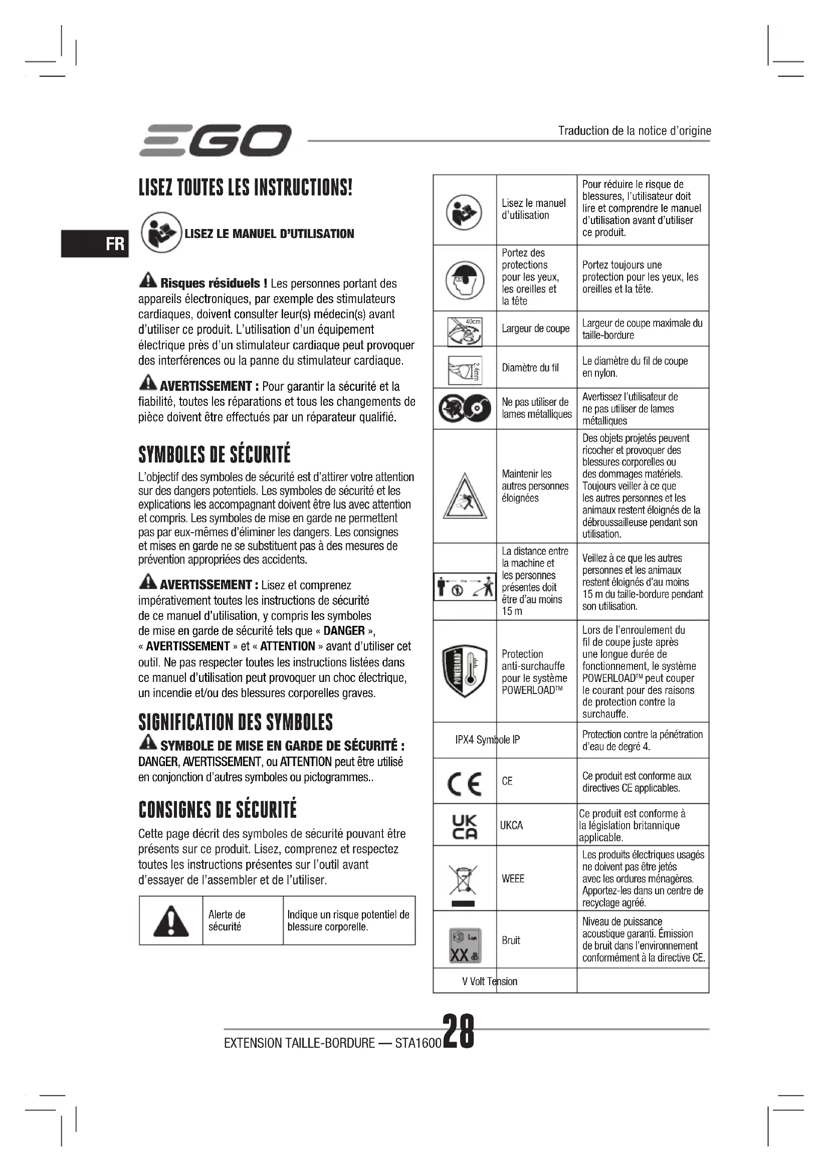 Cette page décrit des symboles de sécurité pouvant être présents sur ce produit. Lisez, comprenez et respectez toutes les instructions présentes sur l’outil avant d’essayer de l’assembler et de l’utiliser.Alerte de sécuritéIndique un risque potentiel de blessure corporelle.Lisez le manuel d’utilisationPour réduire le risque de blessures, l’utilisateur doit lire et comprendre le manuel d’utilisation avant d’utiliser ce produit.Portez des protections pour les yeux, les oreilles et la têtePortez toujours une protection pour les yeux, les oreilles et la tête. 40cm Largeur de coupeLargeur de coupe maximale du taille-bordure 2.4mm Diamètre du lLe diamètre du l de coupe en nylon.Ne pas utiliser de lames métalliquesAvertissez l’utilisateur de ne pas utiliser de lames métalliques Maintenir les autres personnes éloignéesDes objets projetés peuvent ricocher et provoquer des blessures corporelles ou des dommages matériels. Toujours veiller à ce que les autres personnes et les animaux restent éloignés de la débroussailleuse pendant son utilisation.La distance entre la machine et les personnes présentes doit être d’au moins 15 m Veillez à ce que les autres personnes et les animaux restent éloignés d’au moins 15m du taille-bordure pendant son utilisation.Protection anti-surchauffe pour le système POWERLOAD Lors de l’enroulement du l de coupe juste après une longue durée de fonctionnement, le système POWERLOAD peut couper le courant pour des raisons de protection contre la surchauffe.IPX4 Symbole IPProtection contre la pénétration d’eau de degré 4.