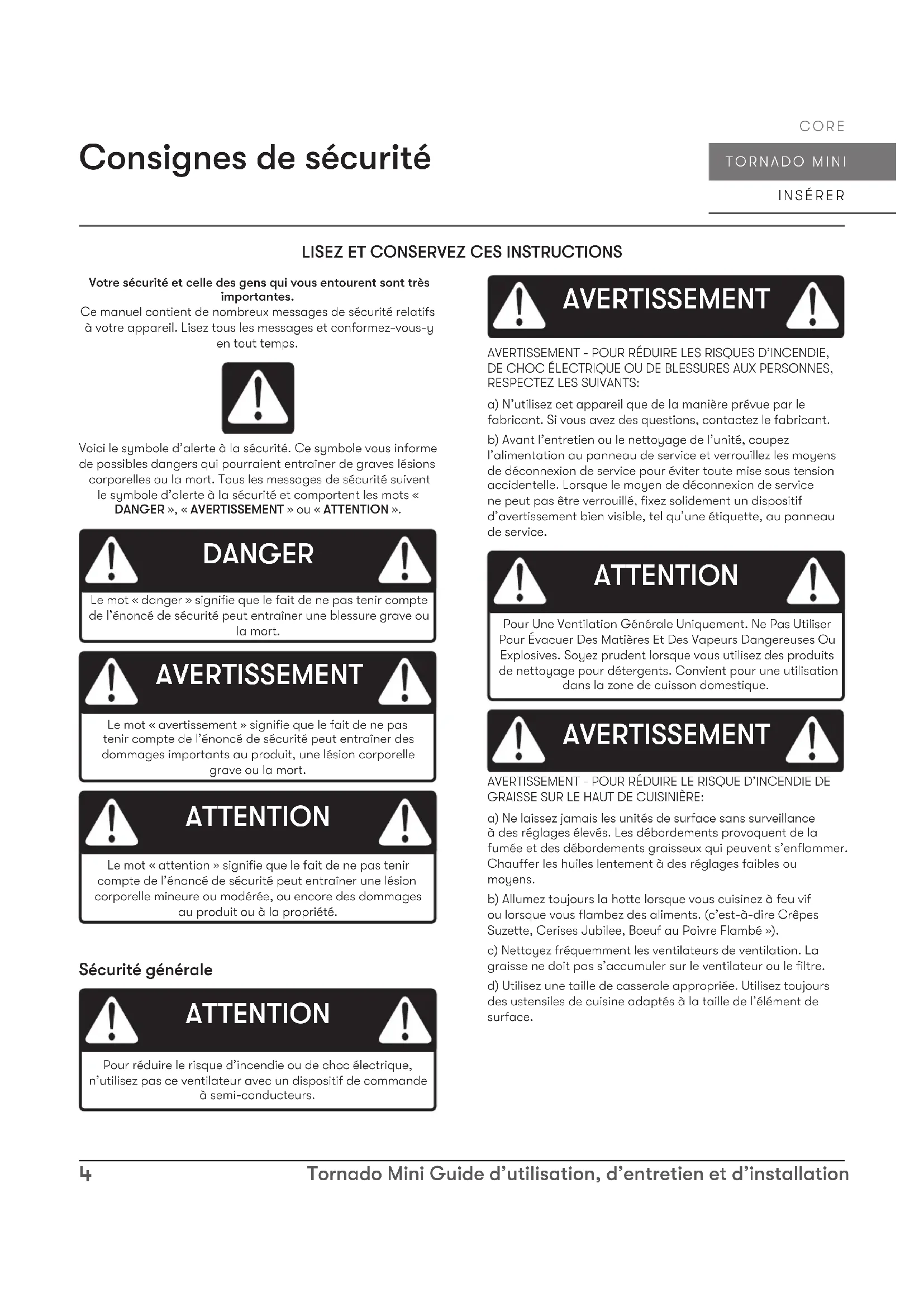 AVERTISSEMENT AVERTISSEMENT - POUR RÉDUIRE LE RISQUE DE BLESSURE DES PERSONNES EN CAS D’INCENDIE DE GRAISSE SUR LE HAUT DE LA CUISINIÈRE, RESPECTEZ CE QUI SUIT:a) DES FLAMMES PLUS INTELLIGENTES avec un couvercle bien ajusté, une plaque à biscuits ou un plateau en métal, puis éteignez le brûleur. FAITES ATTENTION À ÉVITER LES BRÛLURES. Si les flammes ne s’éteignent pas immédiatement, ÉVACUER ET APPELER LE DÉPARTEMENT DES INCENDIES.b) NE JAMAIS RAMASSER UNE PLAQUE ENFLAMME - Vous pourriez être brûlé.c) N’UTILISEZ PAS D’EAU, ni de torchons ou de serviettes humides - une violente explosion de vapeur en résultera.d) Utilisez un extincteur UNIQUEMENT si:1) Vous savez que vous possédez un extincteur de classe ABC et vous savez déjà comment l’utiliser. 2) Le feu est petit et contenu dans la zone où il a commencé. 3) Le service d’incendie est appelé. 4) Vous pouvez combattre le feu dos à une sortieBasé sur “Kitchen Firesafety Tips” publié par la NFPA. AVERTISSEMENT AVERTISSEMENT - POUR RÉDUIRE LES RISQUES D’INCENDIE, DE DÉCHARGE ÉLECTRIQUE OU DE BLESSURES AUX PERSONNES, RESPECTEZ CE QUI SUIT:a) Les travaux d’installation et le câblage électrique doivent être eectués par des personnes qualifiées conformément à tous les codes et normes applicables, y compris la construction résistant au feu.b) Une quantité d’air susante est nécessaire pour une combustion et une évacuation correctes des gaz par le conduit de fumée (cheminée) de l’équipement à combustible pour empêcher le refoulement. Suivez les directives et les normes de sécurité du fabricant de l’équipement de chauage, telles que celles publiées par la National Fire Protection Association (NFPA), l’American Society for Heating, Refrigeration and Air Conditioning Engineers (ASHRAE) et les autorités locales du code.c) Lorsque vous coupez ou percez dans un mur ou un plafond, n’endommagez pas le câblage électrique et les autres services publics cachés.d) Les ventilateurs à conduit doivent toujours être ventilés vers l’extérieur.e) Si cet appareil doit être installé au-dessus d’une baignoire ou d’une douche, il doit être marqué comme approprié pour l’application et être connecté à un circuit de dérivation protégé par un disjoncteur de fuite à la terre (GFCI). AVERTISSEMENT AVERTISSEMENTPOUR RÉDUIRE LES RISQUES D’INCENDIE, UTILISEZ UNIQUEMENT DES CONDUITS MÉTALLIQUES. ATTENTION Pour réduire les risques d’incendie et pour évacuer correctement l’air extérieur, ne pas évacuer l’air évacué dans les espaces à l’intérieur des murs, plafonds, greniers, vides sanitaires ou garages. AVERTISSEMENT Prop. 65 Avertissement pour les résidents de Californie: Ce produit peut contenir des produits chimiques reconnus par l’État de Californie comme pouvant provoquer le cancer, des malformations congénitales ou d’autres troubles de la reproduction.6 Tornado Mini Guide d’utilisation, d’entretien et d’installation INSÉRER CORE TORNADO MINI Consignes de sécurité