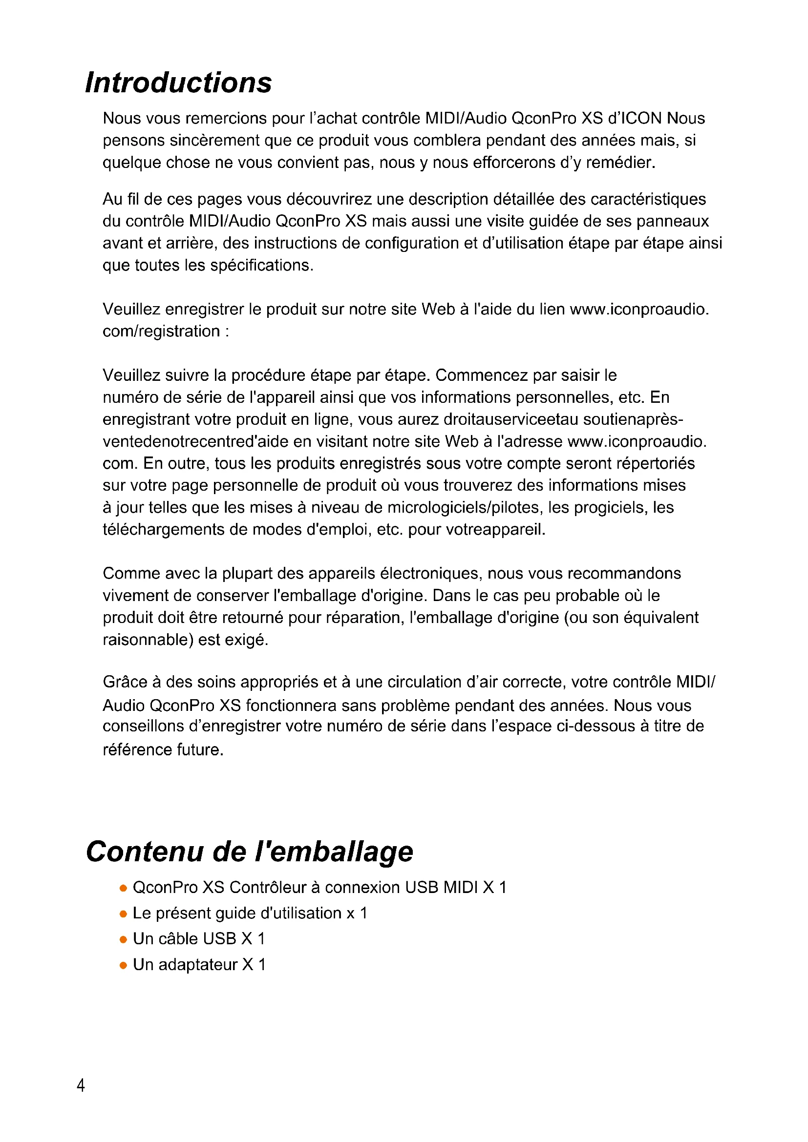 - Entretien et réparations Contents4 Introductions Contenu de l'emballage ● QconPro XS Contrôleur à connexion USB MIDI X 1 ● Le présent guide d'utilisation x 1 ● Un câble USB X 1 ● Un adaptateur X 1 Nous vous remercions pour l’achat contrôle MIDI/Audio QconPro XS d’ICON Nous pensons sincèrement que ce produit vous comblera pendant des années mais, si quelque chose ne vous convient pas, nous y nous efforcerons d’y remédier. Au l de ces pages vous découvrirez une description détaillée des caractéristiques du contrôle MIDI/Audio QconPro XS mais aussi une visite guidée de ses panneaux avant et arrière, des instructions de conguration et d’utilisation étape par étape ainsi que toutes les spécications. Veuillez enregistrer le produit sur notre site Web à l'aide du lien www.iconproaudio. com/registration : Veuillez suivre la procédure étape par étape. Commencez par saisir le numéro de série de l'appareil ainsi que vos informations personnelles, etc. En enregistrant votre produit en ligne, vous aurez droitauserviceetau soutienaprès- ventedenotrecentred'aide en visitant notre site Web à l'adresse www.iconproaudio. com. En outre, tous les produits enregistrés sous votre compte seront répertoriés sur votre page personnelle de produit où vous trouverez des informations mises à jour telles que les mises à niveau de micrologiciels/pilotes, les progiciels, les téléchargements de modes d'emploi, etc. pour votreappareil. Comme avec la plupart des appareils électroniques, nous vous recommandons vivement de conserver l'emballage d'origine. Dans le cas peu probable où le produit doit être retourné pour réparation, l'emballage d'origine (ou son équivalent raisonnable) est exigé. Grâce à des soins appropriés et à une circulation d’air correcte, votre contrôle MIDI/ Audio QconPro XS fonctionnera sans problème pendant des années. Nous vous conseillons d’enregistrer votre numéro de série dans l’espace ci-dessous à titre de référence future.5 Enregistrement de votre produit ICON Pro Audio sur votre compte personnel p. 49