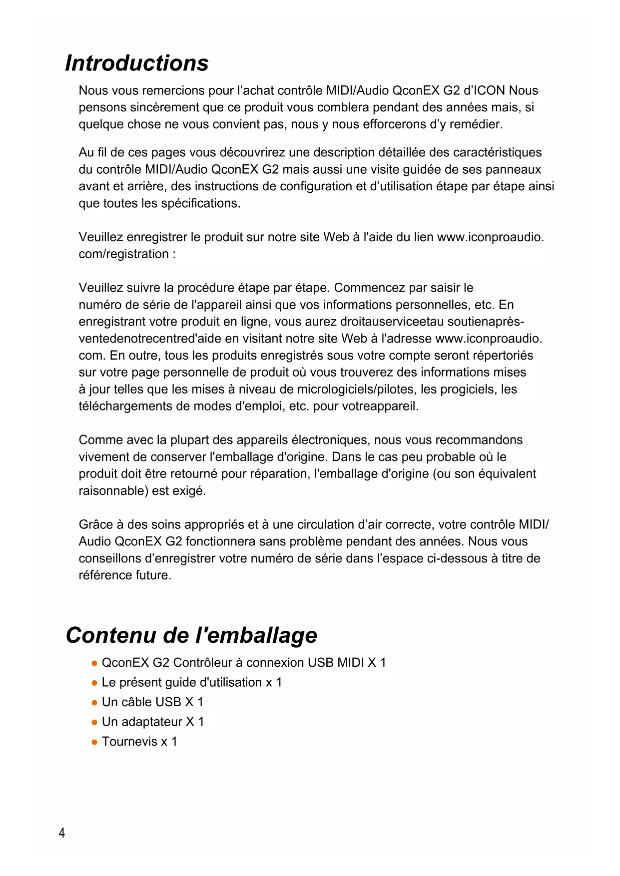 - Entretien et réparations Contenu4 Introductions Contenu de l'emballage ● QconEX G2 Contrôleur à connexion USB MIDI X 1 ● Le présent guide d'utilisation x 1 ● Un câble USB X 1 ● Un adaptateur X 1 ● Tournevis x 1 Nous vous remercions pour l’achat contrôle MIDI/Audio QconEX G2 d’ICON Nous pensons sincèrement que ce produit vous comblera pendant des années mais, si quelque chose ne vous convient pas, nous y nous efforcerons d’y remédier. Au l de ces pages vous découvrirez une description détaillée des caractéristiques du contrôle MIDI/Audio QconEX G2 mais aussi une visite guidée de ses panneaux avant et arrière, des instructions de conguration et d’utilisation étape par étape ainsi que toutes les spécications. Veuillez enregistrer le produit sur notre site Web à l'aide du lien www.iconproaudio. com/registration : Veuillez suivre la procédure étape par étape. Commencez par saisir le numéro de série de l'appareil ainsi que vos informations personnelles, etc. En enregistrant votre produit en ligne, vous aurez droitauserviceetau soutienaprès- ventedenotrecentred'aide en visitant notre site Web à l'adresse www.iconproaudio. com. En outre, tous les produits enregistrés sous votre compte seront répertoriés sur votre page personnelle de produit où vous trouverez des informations mises à jour telles que les mises à niveau de micrologiciels/pilotes, les progiciels, les téléchargements de modes d'emploi, etc. pour votreappareil. Comme avec la plupart des appareils électroniques, nous vous recommandons vivement de conserver l'emballage d'origine. Dans le cas peu probable où le produit doit être retourné pour réparation, l'emballage d'origine (ou son équivalent raisonnable) est exigé. Grâce à des soins appropriés et à une circulation d’air correcte, votre contrôle MIDI/ Audio QconEX G2 fonctionnera sans problème pendant des années. Nous vous conseillons d’enregistrer votre numéro de série dans l’espace ci-dessous à titre de référence future.5 Enregistrement de votre produit ICON Pro Audio sur votre compte personnel p. 46