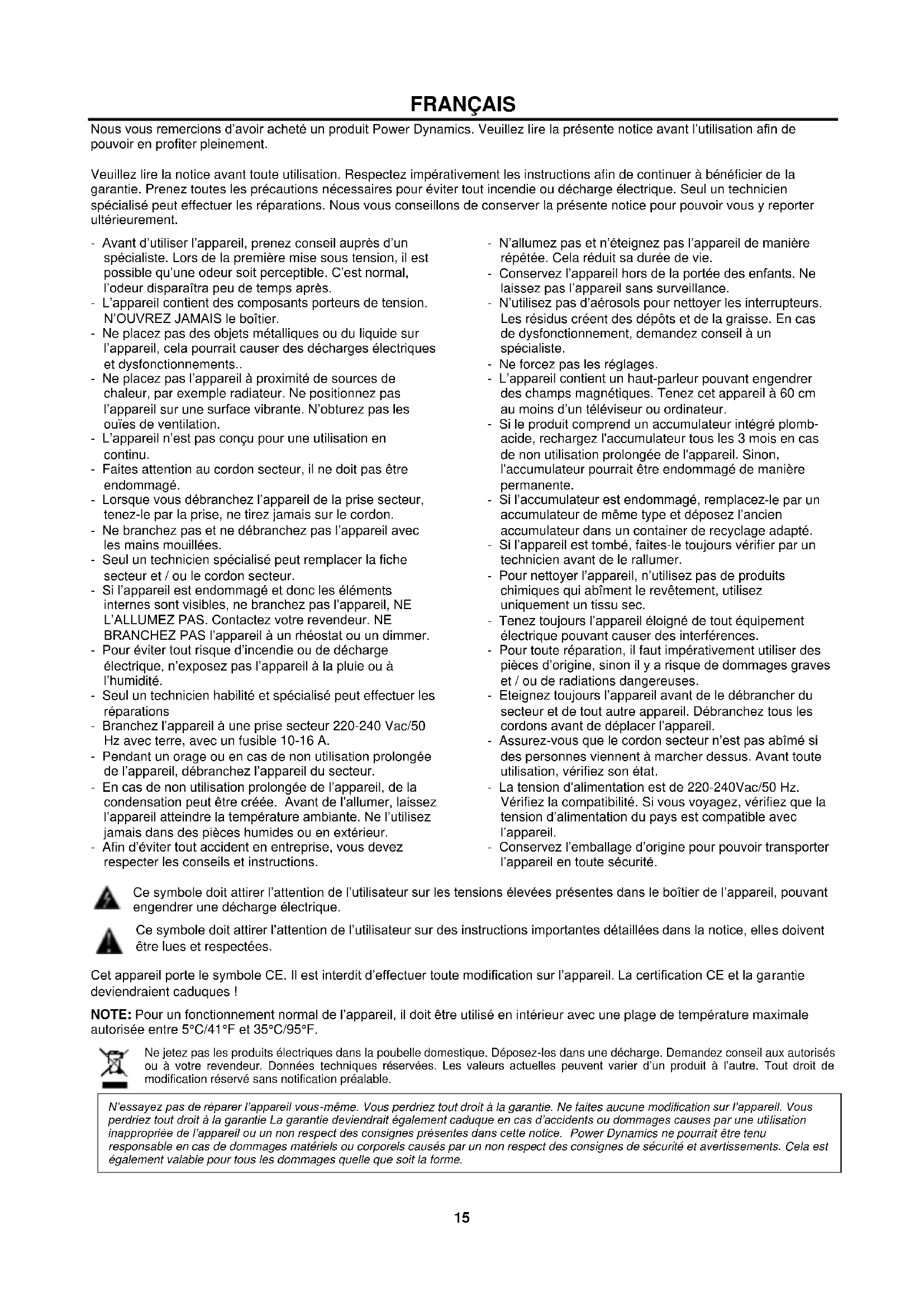 Abra el reproductor Muzo app en su smart phone, la APP buscará automáticamente los altavoces. Siga el asistente wizard paso a paso para configurar y lea la última página del manual.15 FRANÇAIS Nous vous remercions d’avoir acheté un produit Power Dynamics. Veuillez lire la présente notice avant l’utilisation afin de pouvoir en profiter pleinement. Veuillez lire la notice avant toute utilisation. Respectez impérativement les instructions afin de continuer à bénéficier de la garantie. Prenez toutes les précautions nécessaires pour éviter tout incendie ou décharge électrique. Seul un technicien spécialisé peut effectuer les réparations. Nous vous conseillons de conserver la présente notice pour pouvoir vous y reporter ultérieurement. - Avant d’utiliser l’appareil, prenez conseil auprès d’un spécialiste. Lors de la première mise sous tension, il est possible qu’une odeur soit perceptible. C’est normal, l’odeur disparaîtra peu de temps après. - L’appareil contient des composants porteurs de tension. N’OUVREZ JAMAIS le boîtier. - Ne placez pas des objets métalliques ou du liquide sur l’appareil, cela pourrait causer des décharges électriques et dysfonctionnements.. - Ne placez pas l’appareil à proximité de sources de chaleur, par exemple radiateur. Ne positionnez pas l’appareil sur une surface vibrante. N’obturez pas les ouïes de ventilation. - L’appareil n’est pas conçu pour une utilisation en continu. - Faites attention au cordon secteur, il ne doit pas être endommagé. - Lorsque vous débranchez l’appareil de la prise secteur, tenez-le par la prise, ne tirez jamais sur le cordon. - Ne branchez pas et ne débranchez pas l’appareil avec les mains mouillées. - Seul un technicien spécialisé peut remplacer la fiche secteur et / ou le cordon secteur. - Si l’appareil est endommagé et donc les éléments internes sont visibles, ne branchez pas l’appareil, NE L’ALLUMEZ PAS. Contactez votre revendeur. NE BRANCHEZ PAS l’appareil à un rhéostat ou un dimmer. - Pour éviter tout risque d’incendie ou de décharge électrique, n’exposez pas l’appareil à la pluie ou à l’humidité. - Seul un technicien habilité et spécialisé peut effectuer les réparations - Branchez l’appareil à une prise secteur 220-240 Vac/50 Hz avec terre, avec un fusible 10-16 A. - Pendant un orage ou en cas de non utilisation prolongée de l’appareil, débranchez l’appareil du secteur. - En cas de non utilisation prolongée de l’appareil, de la condensation peut être créée. Avant de l’allumer, laissez l’appareil atteindre la température ambiante. Ne l’utilisez jamais dans des pièces humides ou en extérieur. - Afin d’éviter tout accident en entreprise, vous devez respecter les conseils et instructions. - N’allumez pas et n’éteignez pas l’appareil de manière répétée. Cela réduit sa durée de vie. - Conservez l’appareil hors de la portée des enfants. Ne laissez pas l’appareil sans surveillance. - N’utilisez pas d’aérosols pour nettoyer les interrupteurs. Les résidus créent des dépôts et de la graisse. En cas de dysfonctionnement, demandez conseil à un spécialiste. - Ne forcez pas les réglages. - L’appareil contient un haut-parleur pouvant engendrer des champs magnétiques. Tenez cet appareil à 60 cm au moins d’un téléviseur ou ordinateur. - Si le produit comprend un accumulateur intégré plomb- acide, rechargez l'accumulateur tous les 3 mois en cas de non utilisation prolongée de l'appareil. Sinon, l'accumulateur pourrait être endommagé de manière permanente. - Si l’accumulateur est endommagé, remplacez-le par un accumulateur de même type et déposez l’ancien accumulateur dans un container de recyclage adapté. - Si l’appareil est tombé, faites-le toujours vérifier par un technicien avant de le rallumer. - Pour nettoyer l’appareil, n’utilisez pas de produits chimiques qui abîment le revêtement, utilisez uniquement un tissu sec. - Tenez toujours l’appareil éloigné de tout équipement électrique pouvant causer des interférences. - Pour toute réparation, il faut impérativement utiliser des pièces d’origine, sinon il y a risque de dommages graves et / ou de radiations dangereuses. - Eteignez toujours l’appareil avant de le débrancher du secteur et de tout autre appareil. Débranchez tous les cordons avant de déplacer l’appareil. - Assurez-vous que le cordon secteur n’est pas abîmé si des personnes viennent à marcher dessus. Avant toute utilisation, vérifiez son état. - La tension d’alimentation est de 220-240Vac/50 Hz. Vérifiez la compatibilité. Si vous voyagez, vérifiez que la tension d’alimentation du pays est compatible avec l’appareil. - Conservez l’emballage d’origine pour pouvoir transporter l’appareil en toute sécurité. Ce symbole doit attirer l’attention de l’utilisateur sur les tensions élevées présentes dans le boîtier de l’appareil, pouvant engendrer une décharge électrique. Ce symbole doit attirer l’attention de l’utilisateur sur des instructions importantes détaillées dans la notice, elles doivent être lues et respectées. Cet appareil porte le symbole CE. Il est interdit d’effectuer toute modification sur l’appareil. La certification CE et la garantie deviendraient caduques ! NOTE: Pour un fonctionnement normal de l’appareil, il doit être utilisé en intérieur avec une plage de température maximale autorisée entre 5°C/41°F et 35°C/95°F. Ne jetez pas les produits électriques dans la poubelle domestique. Déposez-les dans une décharge. Demandez conseil aux autorisés ou à votre revendeur. Données techniques réservées. Les valeurs actuelles peuvent varier d’un produit à l’autre. Tout droit de modification réservé sans notification préalable. N’essayez pas de réparer l’appareil vous-même. Vous perdriez tout droit à la garantie. Ne faites aucune modification sur l
