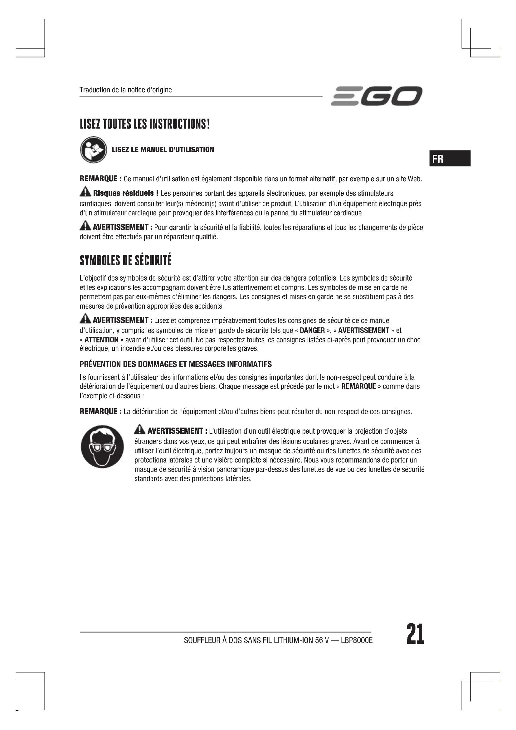 LBP8000E - Souffleur EGO - Notice d'utilisation et mode d'emploi gratuit