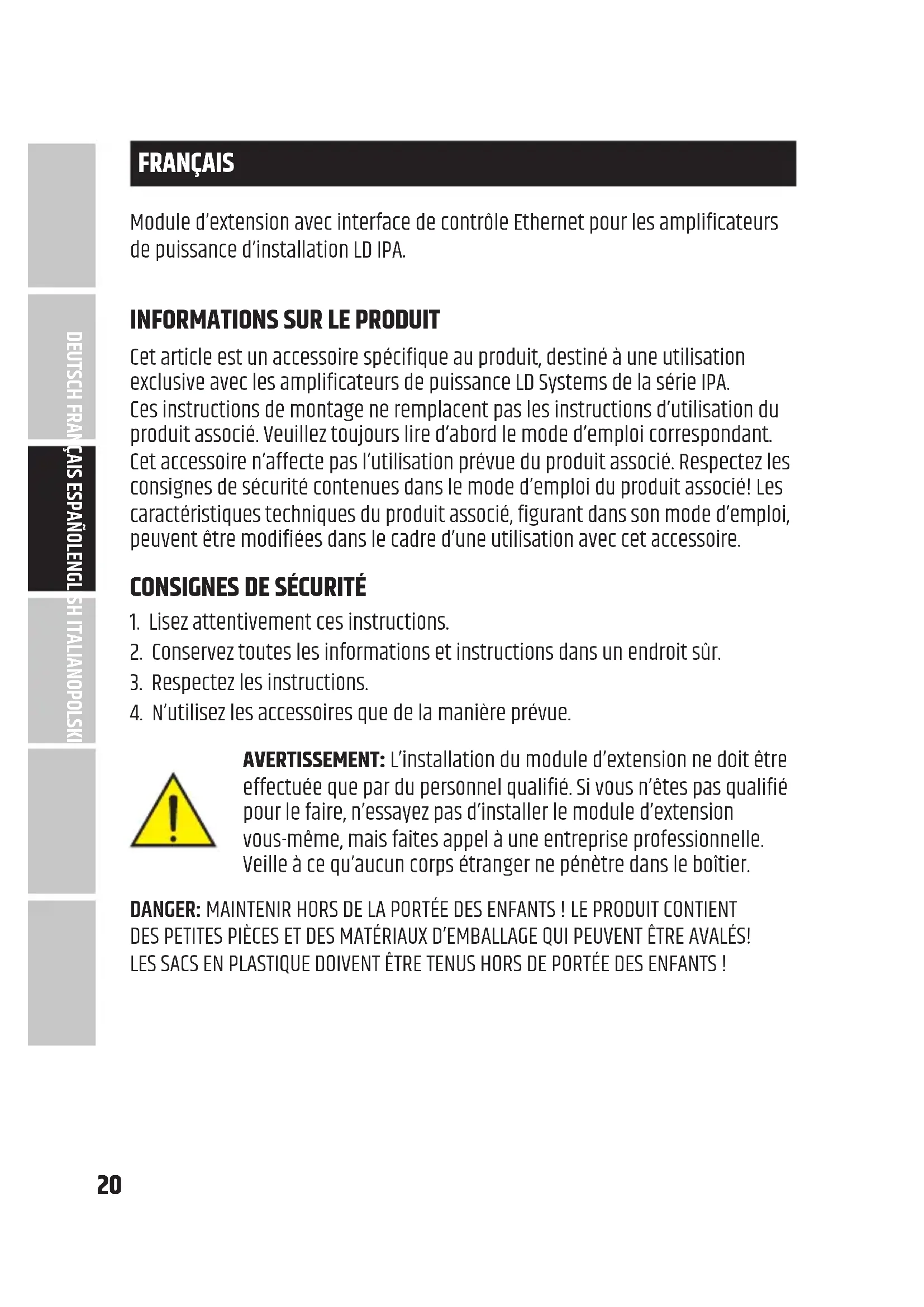 ENGLISH20 FRANÇAIS Module d’extension avec interface de contrôle Ethernet pour les amplificateurs de puissance d’installation LD IPA.