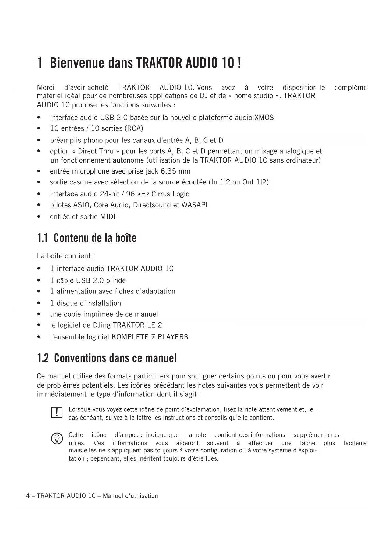 10.2Différentstypesd’ASIO .................................................................................734–TRAKTORAUDIO10–Manueld’utilisation 1 BienvenuedansTRAKTORAUDIO10! Merci d’avoiracheté TRAKTOR AUDIO10.Vous avez à votre dispositionle complément matérielidéalpourdenombreusesapplicationsdeDJetde«homestudio».TRAKTOR AUDIO10proposelesfonctionssuivantes: