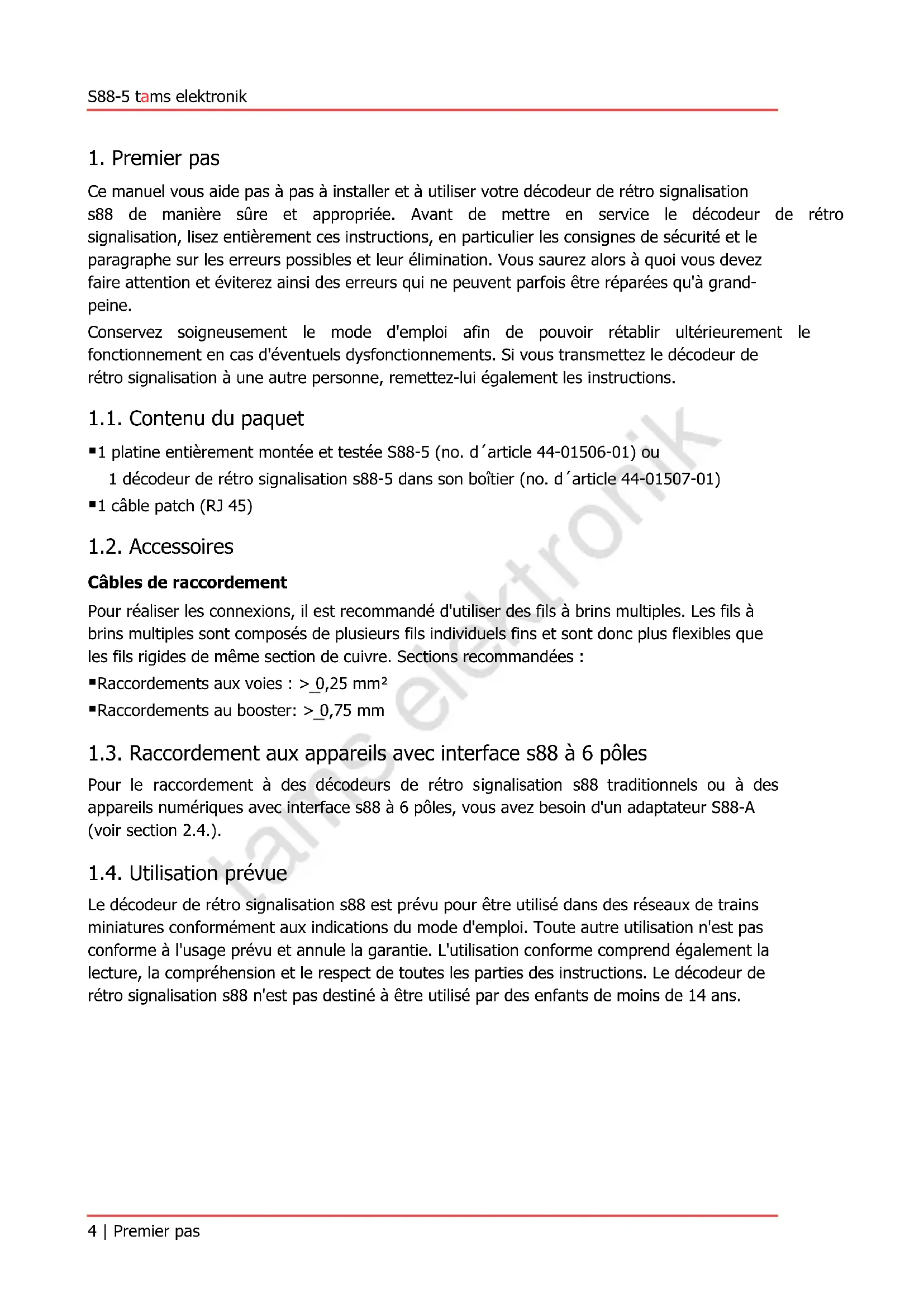 - tams elektronik S88-5 Décodeur de rétro signalisation s88 avec détecteur d'occupation de la voie intégré à 8 entrées Mode d'emploi No. d´article 44-01506 | 44-01507 tams elektronik n n ntams elektronik S88-5 tams elektronik Version 2.0 | Mise à jour : 11/2022 © Tams Elektronik GmbH Tous droits réservés, notamment le droit de reproduction et de distribution ainsi que de traduction. Les copies, reproductions et modifications sous quelque forme que ce soit nécessitent l'autorisation écrite de Tams Elektronik GmbH. Nous nous réservons le droit d'apporter des modifications techniques. Impression du mode d'emploi Le formatage est optimisé pour l'impression recto-verso. Le format standard des pages est DIN A5. Si vous préférez un affichage plus grand, il est recommandé d'imprimer sur le format DIN A4. ** Les astérisques Les fabricants suivants et leurs produits sont cités dans ce mode d'emploi : Gebr. MÄRKLIN & Cie. GmbH | Stuttgarter Straße 55-57 | DE-73033 Göppingen 2 | Contenutams elektronik tams elektronik S88-5 Contenu 1. Premier pas p. 4