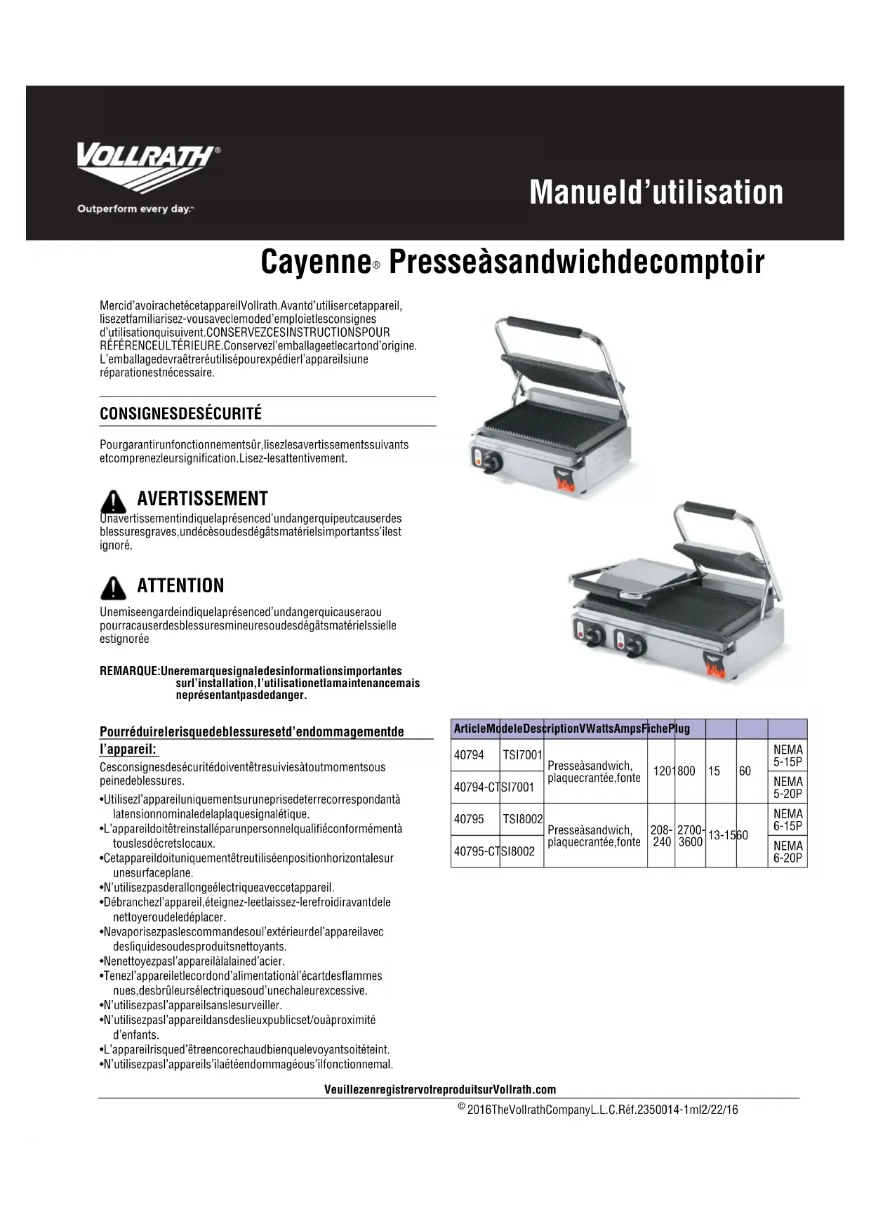 40794C - Plaque de grill Vollrath - Notice d'utilisation et mode d'emploi gratuit