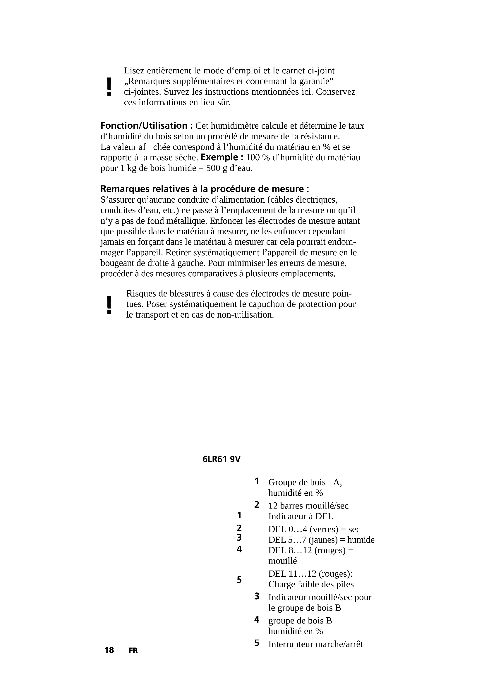 Groupe de boisA, humidité en % 12 barres mouillé/sec Indicateur à DEL DEL 0…4 (vertes) = sec DEL 5…7 (jaunes) = humide DEL 8…12 (rouges) = mouillé DEL 11…12 (rouges): Charge faible des piles Indicateur mouillé/sec pour le groupe de bois B groupe de bois B humidité en % Interrupteur marche/arrêt Risques de blessures à cause des électrodes de mesure poin- tues. Poser systématiquement le capuchon de protection pour le transport et en cas de non-utilisation.