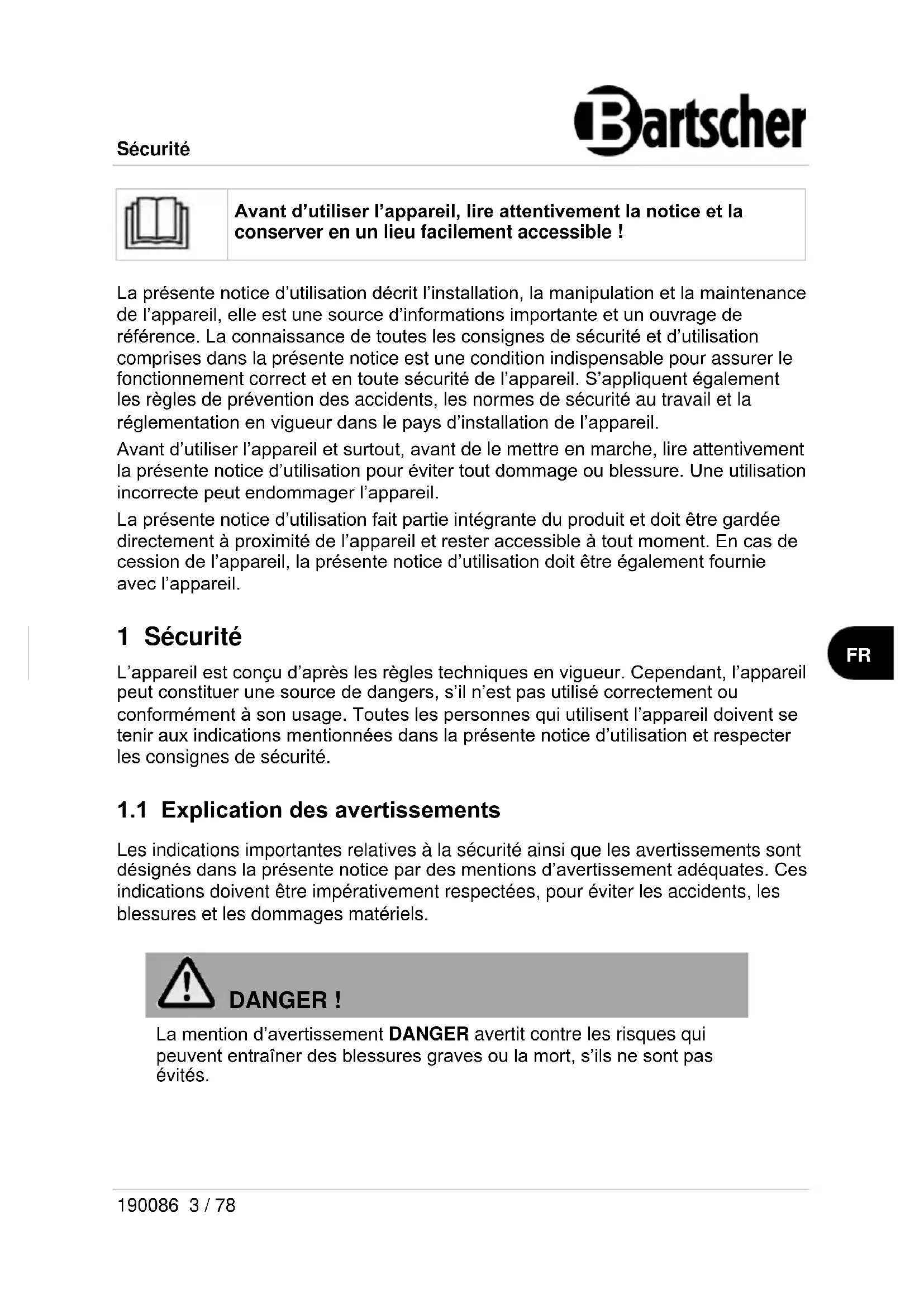 DANGER ! La mention d’avertissement DANGER avertit contre les risques qui peuvent entraîner des blessures graves ou la mort, s’ils ne sont pas évités.Sécurité 4 / 78 190086