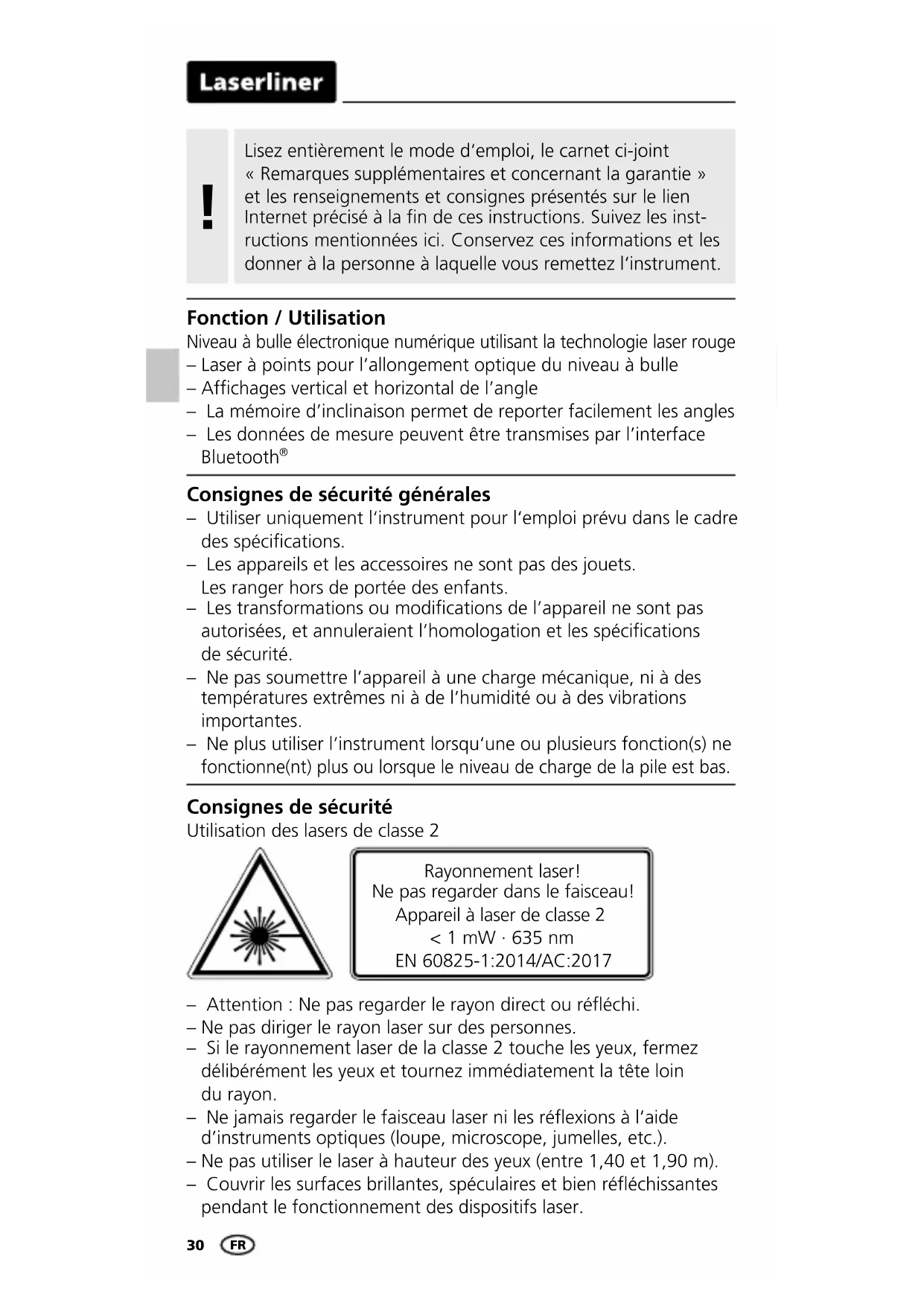Kalibrering Måleapparatet skal jævnligt kalibreres og kontrolleres for at garantere præcisionen og funktionen. Vi anbefaler et kalibreringsinterval på et år. Kontakt din forhandler eller henvend til til serviceafdelingen i UMAREX-LASERLINER. EU-bestemmelser og bortskaffelse Apparatet opfylder alle påkrævede standarder for fri vareomsætning inden for EU. Dette produkt er et elapparat og skal indsamles og bortskaffes separat i henhold til EF-direktivet for (brugte) elapparater. Flere sikkerhedsanvisninger og supplerende tips på: http://laserliner.com/info?an=AHJ Forbehold for tekniske ændringer. 20W36 Tekniske data Nøjagtighed elektronisk måling ± 0,05° ved 0° … 1° ± 0,1° ved 1° … 89° ± 0,05° ved 89° … 90° Libellenøjagtighed ± 0,5 mm/m Visningsnøjagtighed 2 decimaler Laserbølgelængde 635 nm Laserklasse 2 / < 1 mW (EN 60825-1:2014/AC:2017) Strømkilde 2 x 1,5V LR03 (AAA) Driftstid med laser: ca. 10 timer uden laser: ca. 55 timer Driftsdata radiomodul Interface Bluetooth LE 4.x; Frekvensbånd: ISM-bånd 2400-2483,5 MHz, 40 kanaler; Sendeeffekt: max 10 mW; Båndbredde: 2 MHz; Bitrate: 1 Mbit/s; modulation: GFSK / FHSS Arbejdsbetingelser -10°C … 50°C, luftfugtighed maks. 80% rH, Ikke-kondenserende, arbejdshøjde maks. 2000 m.o.h. Opbevaringsbetingelser -20°C … 70°C, luftfugtighed maks. 80% rH Mål 40 400 x 63 x 33 mm (B x H x D) Mål 60 600 x 63 x 33 mm (B x H x D) Mål 80 800 x 63 x 33 mm (B x H x D) Mål 100 1000 x 63 x 33 mm (B x H x D) Mål 120 1200 x 63 x 33 mm (B x H x D) Vægt 40/60/80/100/120 548 g / 722 g / 968 g / 1105 g / 1360 g (inkl. batterier) DA30 Consignes de sécurité Utilisation des lasers de classe 2 – Attention : Ne pas regarder le rayon direct ou rééchi. – Ne pas diriger le rayon laser sur des personnes. – Si le rayonnement laser de la classe 2 touche les yeux, fermez délibérément les yeux et tournez immédiatement la tête loin du rayon. – Ne jamais regarder le faisceau laser ni les réexions à l’aide d’instruments optiques (loupe, microscope, jumelles, etc.). – Ne pas utiliser le laser à hauteur des yeux (entre 1,40 et 1,90 m). – Couvrir les surfaces brillantes, spéculaires et bien rééchissantes pendant le fonctionnement des dispositifs laser. Rayonnement laser! Ne pas regarder dans le faisceau! Appareil à laser de classe 2 < 1 mW · 635 nm EN 60825-1:2014/AC:2017 Consignes de sécurité générales – Utiliser uniquement l‘instrument pour l‘emploi prévu dans le cadre des spécications. – Les appareils et les accessoires ne sont pas des jouets. Les ranger hors de portée des enfants. – Les transformations ou modications de l’appareil ne sont pas autorisées, et annuleraient l’homologation et les spécications de sécurité. – Ne pas soumettre l’appareil à une charge mécanique, ni à des températures extrêmes ni à de l’humidité ou à des vibrations importantes. – Ne plus utiliser l‘instrument lorsqu‘une ou plusieurs fonction(s) ne fonctionne(nt) plus ou lorsque le niveau de charge de la pile est bas. Niveau à bulle électronique numérique utilisant la technologie laser rouge – Laser à points pour l’allongement optique du niveau à bulle – Afchages vertical et horizontal de l’angle – La mémoire d’inclinaison permet de reporter facilement les angles – Les données de mesure peuvent être transmises par l’interface Bluetooth