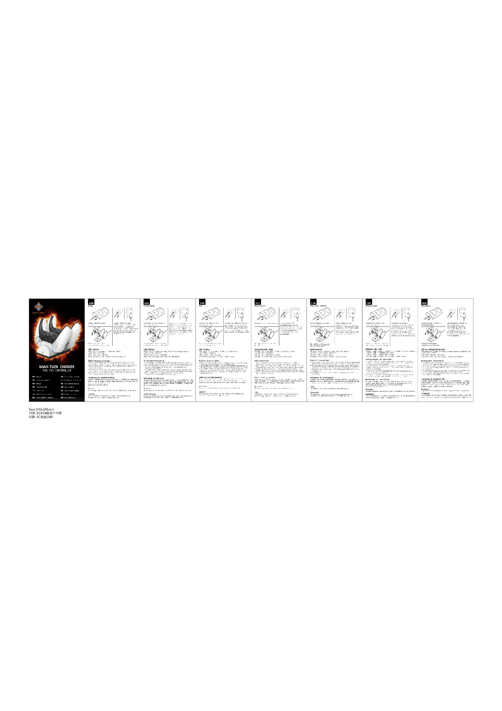 - Lumière rouge pendant 2 secondes : le produit est sous tension.•Lumière rouge : chargement en cours.•Lumière bleue : complètement chargé.•Les LED rouge et bleue sont éteintes : mode veille. Nettoyage et entretien Nettoyez le produit avec un chiffon doux et sec. En cas de taches tenaces, vous pouvez utiliser un produit de nettoyage doux sur un chiffon doux et essuyer avec un chiffon doux et sec.Conserver dans un endroit sec. Garantie Veuillez consulter www.deltaco.eu pour l’information sur la garantie. Assistance Plus d’information sur le produit est disponible sur le site www.deltaco.eu.Contactez-nous par e-mail : help@deltaco.eu.1.Veuillez utiliser le câble inclus pour le chargement. Si vous utilisez un autre câble, assurez-vous qu'il a une compatibilité d'alimentation correspondante. 2.N'ouvrez pas et n'essayez pas de réparer ce produit vous-même, cela pourrait entraîner un court-circuit ou une électrocution. Contactez plutôt le revendeur.3.Le produit doit être conservé dans un environnement sec et ventilé, ne pas le stocker dans une zone avec une humidité élevée et des températures élevées.4.Veuillez ne pas utiliser de produits chimiques agressifs ou de solvants puissants pour nettoyer la surface du produit. Instructions de sécurité Csatlakoztassa a kábelt a töltőállomáshoz. Használat HUN A töltésükhöz helyezze a kontrollereket a nyílásokba. Csatlakoztassa a kábelt az USB-tápadapterhez vagy közvetlenül az eszközhöz. Javasoljuk, hogy 2A-s USB-tápadaptert használjon a gyorsabb töltés érdekében. Csatlakoztassa az USB-tápadaptert a fali aljzathoz. LED-es állapotkijelzés