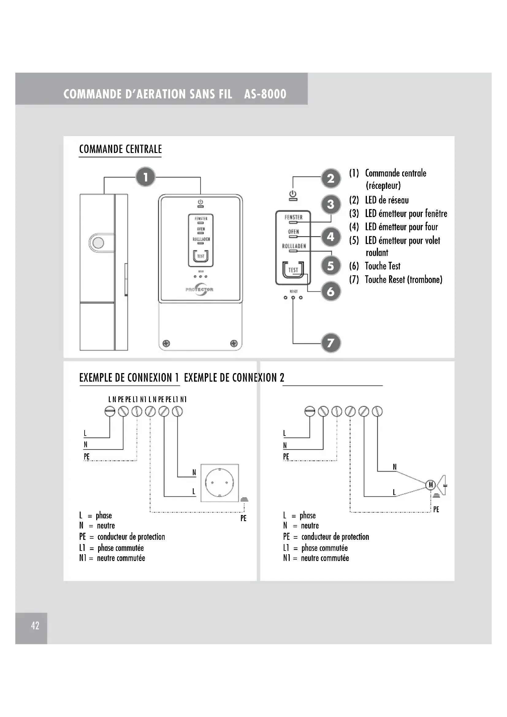 U2425 (Schéma 4) Positionnement de l’émetteur pour volet roulant (vue latérale) Volet roulant fermé ouvert Émetteur Volet roulant Aimant Volet roulant AimantCOMMANDE D’AERATION SANS FIL AS-8000 Nous vous remercions d’avoir acheté la commande d’aération sans fil PROTECTOR de la série AS-8000. Le manuel d’utilisation fait partie intégrante de l’appareil. Il contient des consignes importantes concernant la sécurité, l’utilisation et la mise au rebut de l’appareil. Familiarisez-vous avec toutes les consignes d’utilisation et de sécurité avant de manipuler l’appareil. Utilisez-le uniquement comme expliqué et pour les domaines d’application spécifiés. Si vous confiez l’appareil à des tiers, remettez-leur également toute la documentation.
