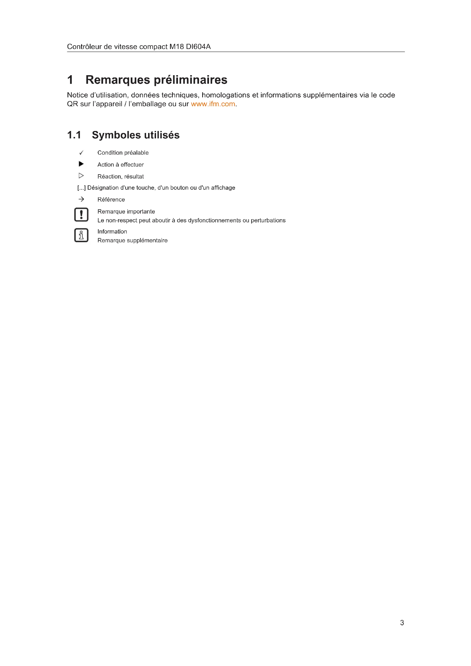 1 Remarques préliminaires Notice d’utilisation, données techniques, homologations et informations supplémentaires via le code QR sur l’appareil / l’emballage ou sur www.ifm.com. 1.1 Symboles utilisés Condition préalable Action à effectuer Réaction, résultat [...] Désignation d'une touche, d'un bouton ou d'un affichage Référence Remarque importante Le non-respect peut aboutir à des dysfonctionnements ou perturbations Information Remarque supplémentaireDI604A Contrôleur de vitesse compact M18