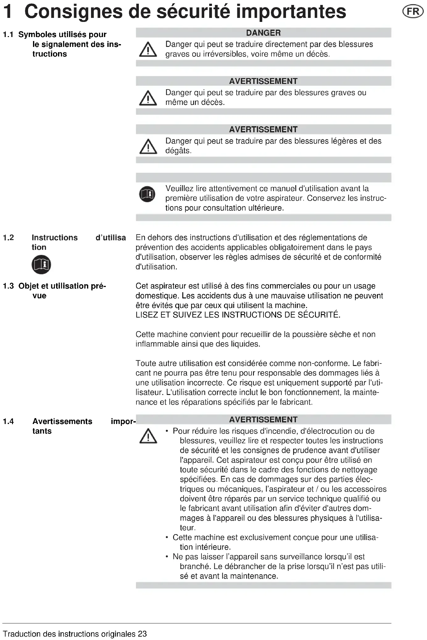 tants 1 Consignes de sécurité importantes Veuillez lire attentivement ce manuel d'utilisation avant la première utilisation de votre aspirateur. Conservez les instruc- tions pour consultation ultérieure.Traduction des instructions originales24 AVERTISSEMENT