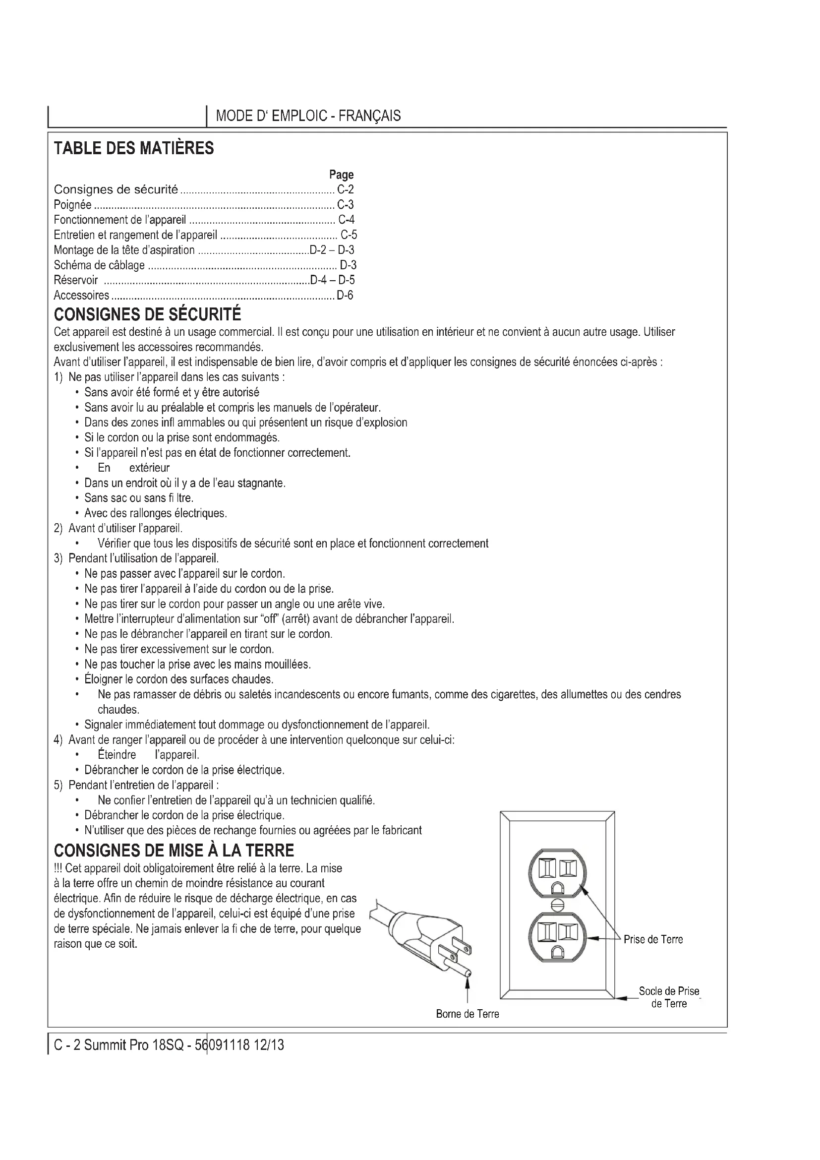 !!! Cet appareil doit obligatoirement être relié à la terre. La mise à la terre offre un chemin de moindre résistance au courant électrique. Afi n de réduire le risque de décharge électrique, en cas de dysfonctionnement de l’appareil, celui-ci est équipé d’une prise de terre spéciale. Ne jamais enlever la fi che de terre, pour quelque raison que ce soit.12/13 C - 3 56091118 - Summit Pro 18SQ