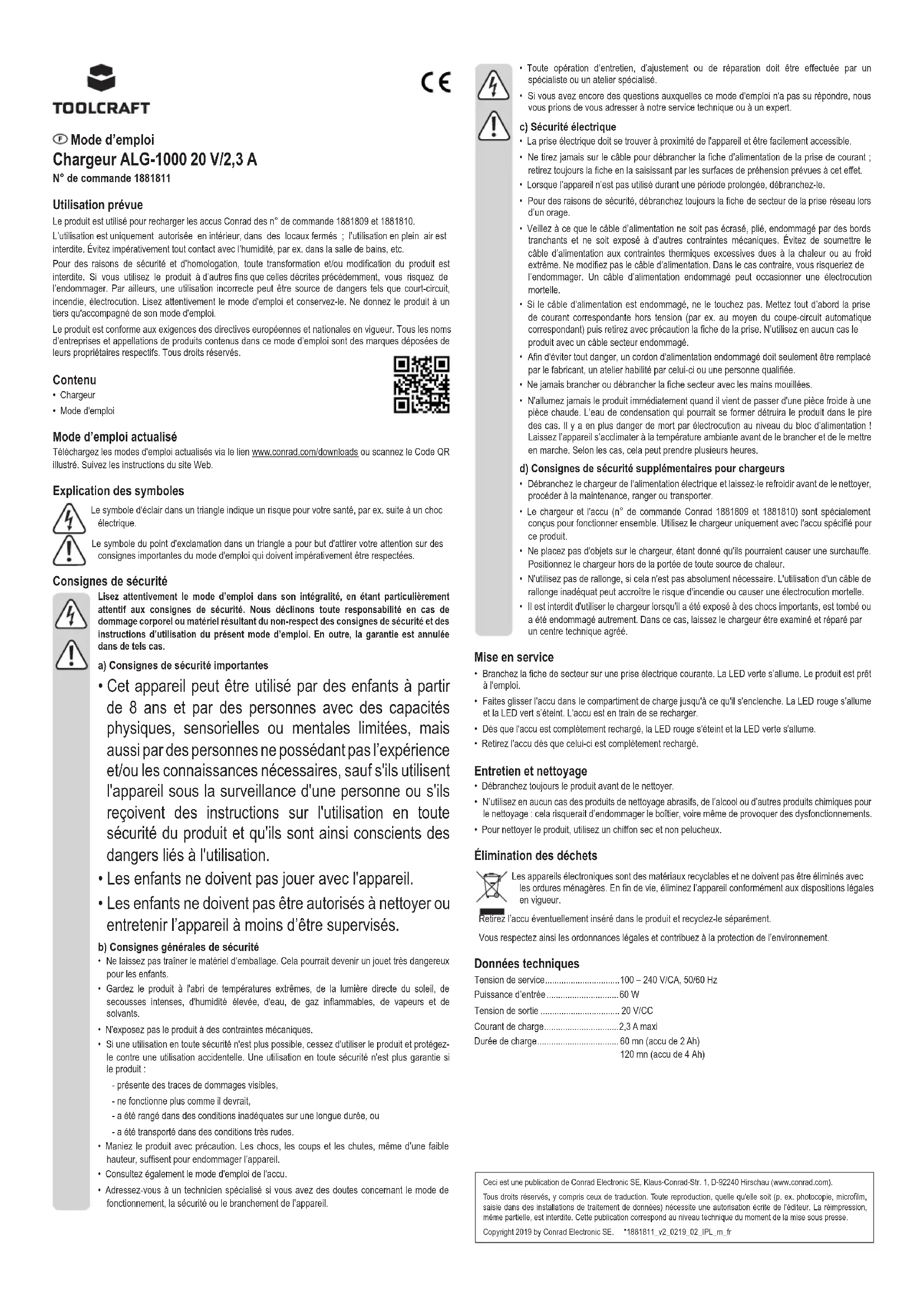 - Pour nettoyer le produit, utilisez un chiffon sec et non pelucheux. Élimination des déchets Les appareils électroniques sont des matériaux recyclables et ne doivent pas être éliminés avec les ordures ménagères. En n de vie, éliminez l’appareil conformément aux dispositions légales en vigueur. Retirez l’accu éventuellement inséré dans le produit et recyclez-le séparément. Vous respectez ainsi les ordonnances légales et contribuez à la protection de l’environnement. Données techniques Tension de service ................................ 100 – 240 V/CA, 50/60 Hz Puissance d’entrée ............................... 60 W Tension de sortie .................................. 20 V/CC Courant de charge ................................ 2,3 A maxi Durée de charge ................................... 60 mn (accu de 2 Ah) 120 mn (accu de 4 Ah) Mode d’emploi Chargeur ALG-1000 20 V/2,3 A N° de commande 1881811 Utilisation prévue Le produit est utilisé pour recharger les accus Conrad des n° de commande 1881809 et 1881810. L’utilisation est uniquement autorisée en intérieur, dans des locaux fermés ; l’utilisation en plein air est interdite. Évitez impérativement tout contact avec l’humidité, par ex. dans la salle de bains, etc. Pour des raisons de sécurité et d’homologation, toute transformation et/ou modication du produit est interdite. Si vous utilisez le produit à d’autres ns que celles décrites précédemment, vous risquez de l’endommager. Par ailleurs, une utilisation incorrecte peut être source de dangers tels que court-circuit, incendie, électrocution. Lisez attentivement le mode d'emploi et conservez-le. Ne donnez le produit à un tiers qu'accompagné de son mode d'emploi. Le produit est conforme aux exigences des directives européennes et nationales en vigueur. Tous les noms d’entreprises et appellations de produits contenus dans ce mode d’emploi sont des marques déposées de leurs propriétaires respectifs. Tous droits réservés. Contenu