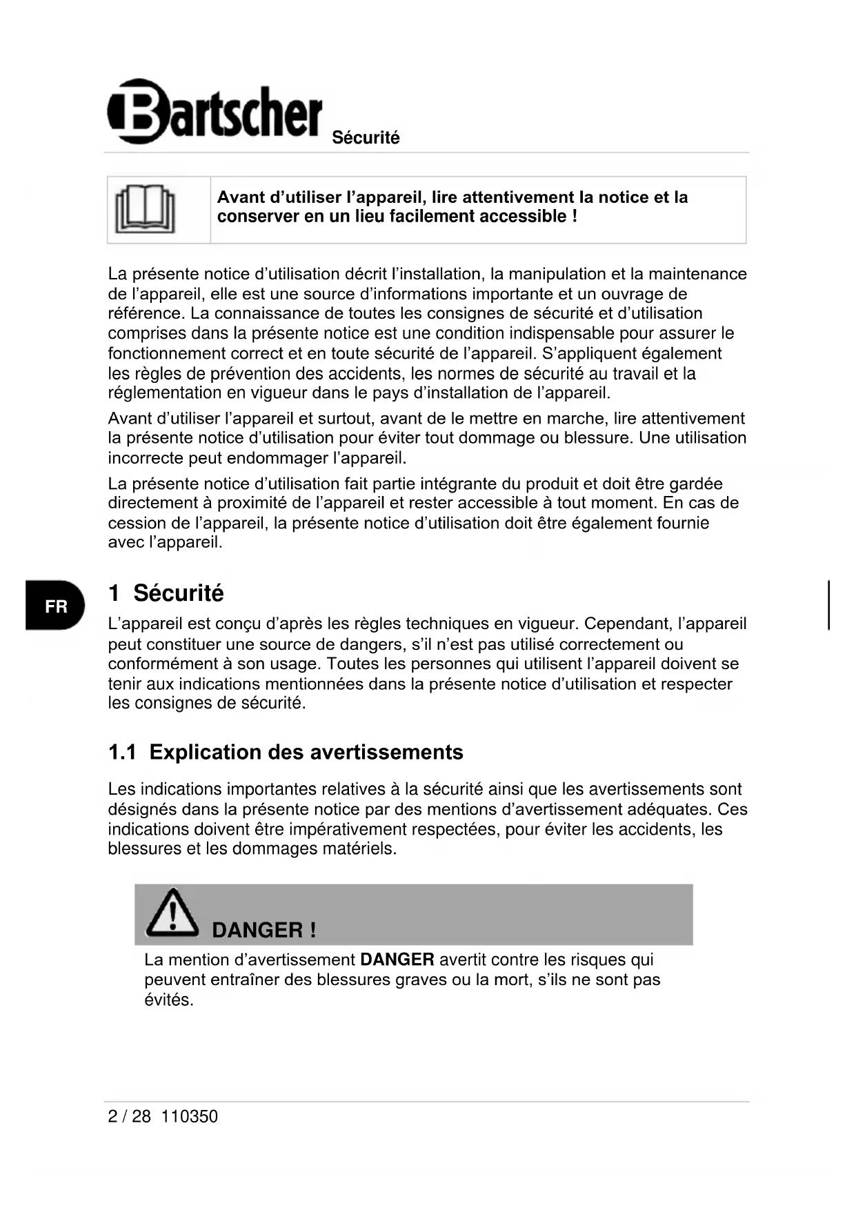 DANGER ! La mention d’avertissement DANGER avertit contre les risques qui peuvent entraîner des blessures graves ou la mort, s’ils ne sont pas évités.Sécurité 110350 3 / 28