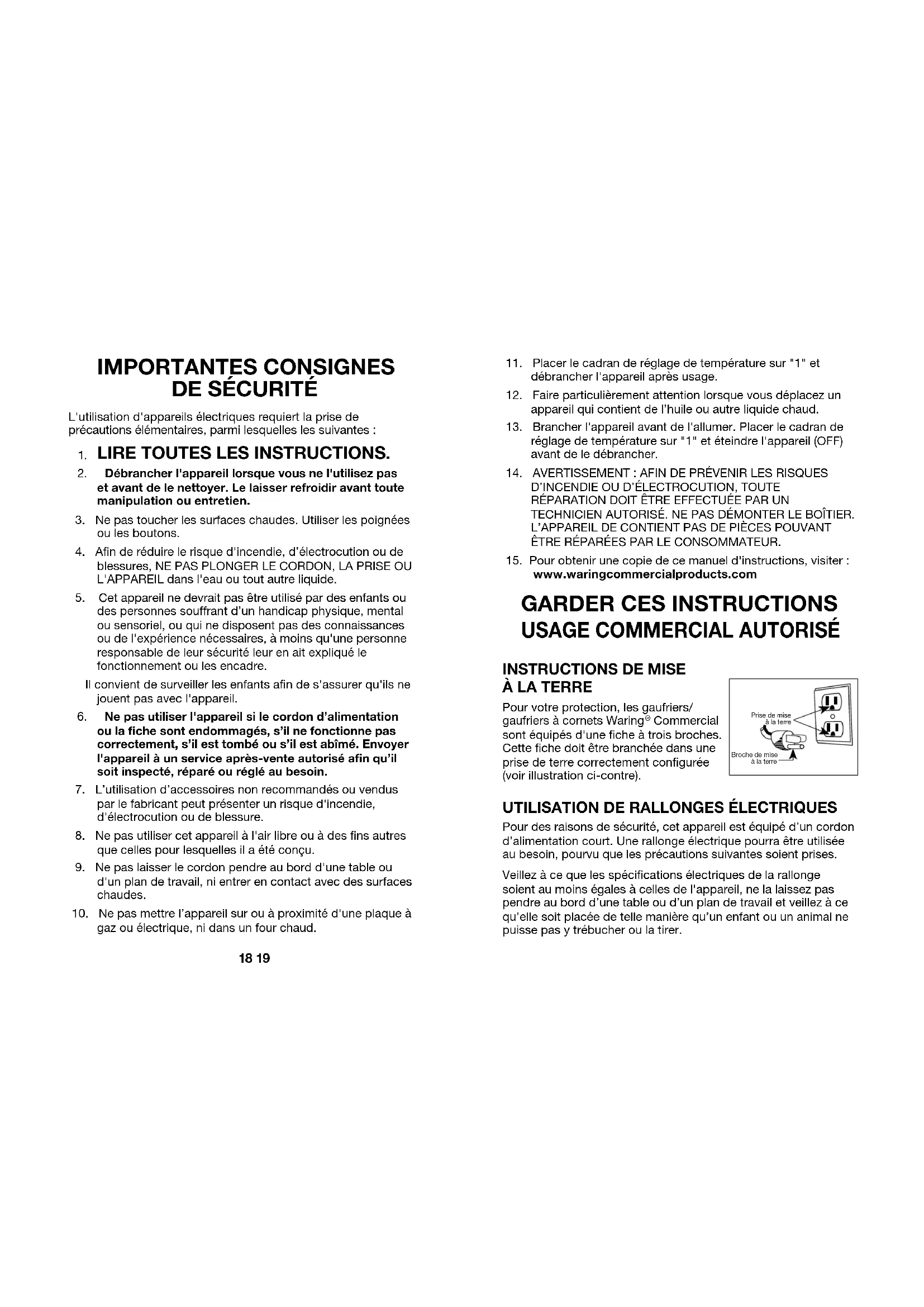 À LA TERRE Pour votre protection, les gaufriers/ gaufriers à cornets Waring