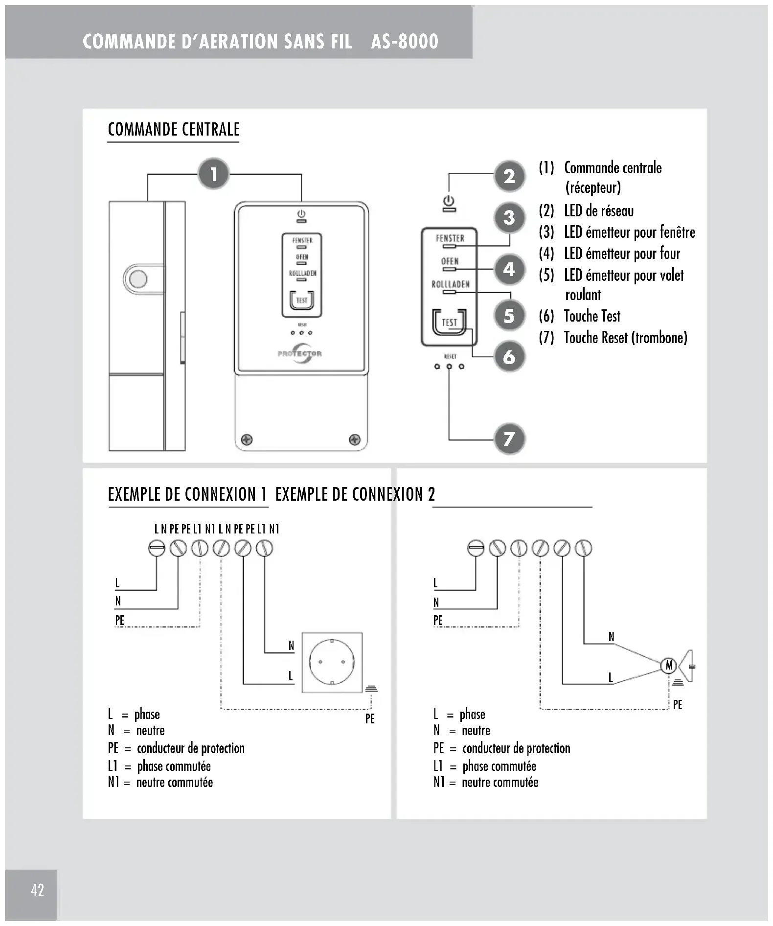 U2425 (Schéma 4) Positionnement de l’émetteur pour volet roulant (vue latérale) Volet roulant fermé ouvert Émetteur Volet roulant Aimant Volet roulant AimantCOMMANDE D’AERATION SANS FIL AS-8000 Nous vous remercions d’avoir acheté la commande d’aération sans fil PROTECTOR de la série AS-8000. Le manuel d’utilisation fait partie intégrante de l’appareil. Il contient des consignes importantes concernant la sécurité, l’utilisation et la mise au rebut de l’appareil. Familiarisez-vous avec toutes les consignes d’utilisation et de sécurité avant de manipuler l’appareil. Utilisez-le uniquement comme expliqué et pour les domaines d’application spécifiés. Si vous confiez l’appareil à des tiers, remettez-leur également toute la documentation.