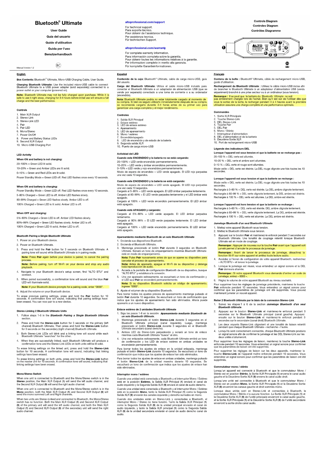 Français Contenu de la boîte : Bluetooth Ultimate, câble de rechargement micro-USB, guide d'utilisation. Rechargement du Bluetooth Ultimate : Utilisez le câble micro-USB inclus afin de brancher le Bluetooth Ultimate à un adaptateur d’alimentation USB (vendu séparément) branché à une prise secteur ou à un ordinateur (sous tension). Remarque : Il se peut que la batterie du Bluetooth Ultimate ne soit pas entièrement chargée lors de l’achat. Bien qu’il est sûr de l’utiliser dès que vous le sortez de la boîte, la recharger pendant 3 à 4 heures avant la première utilisation assurera une charge complète et une performance optimale. Commandes 1. Sortie XLR Principale 2. Touche Stereo-Link 3. DEL Stereo-Link 4. Touche Pair 5. DEL Pair 6. Mono / Stéréo 7. Interrupteur d'alimentation 8. DEL d’alimentation et de la batterie 9. Deuxième Sortie XLR 10. Port de rechargement micro-USB Légende des indicateurs DEL Lorsque l’appareil est sous tension et que la batterie ne se recharge pas : 20–100 % = DEL verte est allumée. 10–20 % = DEL verte et ambre sont allumées. 0–10 % = DEL verte et rouge sont allumées. Mode veille = DEL verte est éteinte. La DEL rouge clignote une fois toutes les 10 secondes. Lorsque l’appareil est sous tension et que la batterie se recharge : Mode veille = DEL verte est éteinte. La DEL rouge clignote une fois toutes les 10 secondes. Rechargée à 5–80 % = DEL verte est éteinte. La DEL ambre clignote lentement. Rechargée à 80–99 % = DEL verte clignote lentement, la DEL ambre est éteinte. Rechargée à 100 % = DEL verte est allumée. La DEL ambre est éteinte. Lorsque l’appareil est hors tension et que la batterie se recharge : Rechargée à 5–80 % = DEL verte est éteinte. DEL ambre clignote lentement. Rechargée à 80–99 % = DEL verte clignote lentement. La DEL ambre est éteinte. Rechargée à 100 % = DEL verte est allumée. La DEL ambre est éteinte. Jumelage Bluetooth d’un seul Bluetooth Ultimate 1. Mettez votre appareil Bluetooth sous tension. 2. Mettez le Bluetooth Ultimate sous tension.