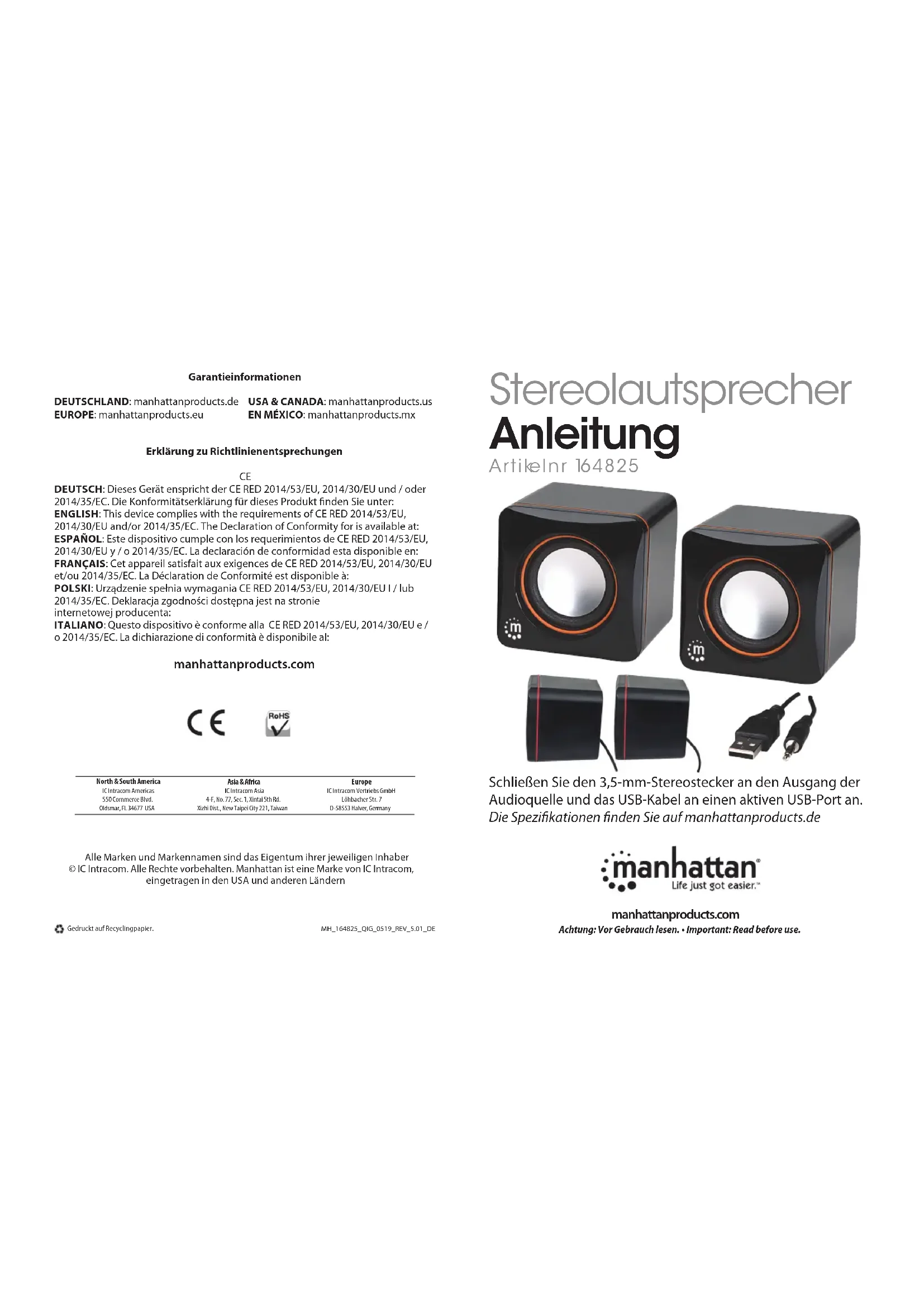 Téléchargez la notice de votre Haut-parleur au format PDF gratuitement ! Retrouvez votre notice 164825 - MANHATTAN et reprennez votre appareil électronique en main. Sur cette page sont publiés tous les documents nécessaires à l'utilisation de votre appareil 164825 de la marque MANHATTAN.