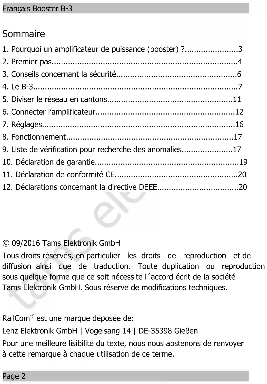 est une marque déposée de: Lenz Elektronik GmbH | Vogelsang 14 | DE-35398 Gießen Pour une meilleure lisibilité du texte, nous nous abstenons de renvoyer à cette remarque à chaque utilisation de ce terme. Page 2tams elektronik Booster B-3 Français