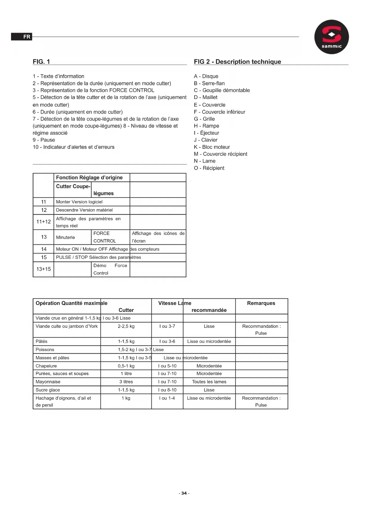 PULSE / STOP Sélection des paramètres 13+15 Démo Force Control Opération Quantité maximale Cutter Vitesse Lame recommandée Remarques Viande crue en général 1-1,5 kg I ou 3-6 Lisse Viande cuite ou jambon d’York 2-2,5 kg I ou 3-7 Lisse Recommandation : Pulse Pâtés 1-1,5 kg I ou 3-6 Lisse ou microdentée Poissons 1,5-2 kg I ou 3-7 Lisse Masses et pâtes 1-1,5 kg I ou 3-5 Lisse ou microdentée Chapelure 0,5-1 kg I ou 5-10 Microdentée Purées, sauces et soupes 1 litre I ou 7-10 Microdentée Mayonnaise 3 litres I ou 7-10 Toutes les lames Sucre glace 1-1,5 kg I ou 8-10 Lisse Hachage d’oignons, d’ail et de persil 1 kg I ou 1-4 Lisse ou microdentée Recommandation : Pulse FIG 2 - Description technique A - Disque B - Serre-an C - Goupille démontable D - Maillet E - Couvercle F - Couvercle inférieur G - Grille H - Rampe I - Éjecteur J - Clavier K - Bloc moteur M - Couvercle récipient N - Lame O - Récipient- 35 -