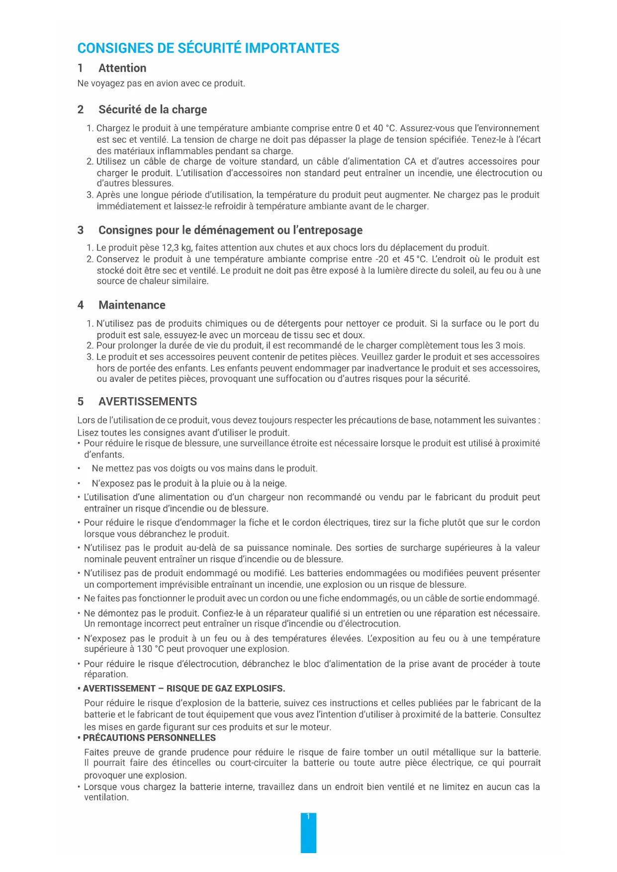 1 Attention Ne voyagez pas en avion avec ce produit. 2 Sécurité de la charge