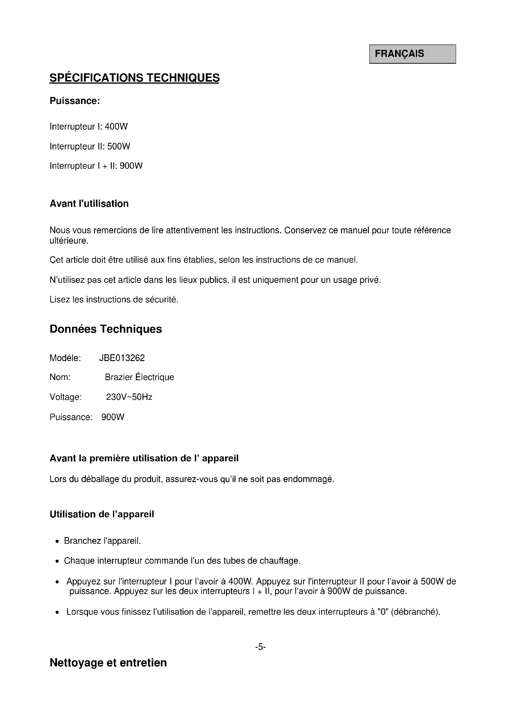 Avant l'utilisation Nous vous remercions de lire attentivement les instructions. Conservez ce manuel pour toute référence ultérieure. Cet article doit être utilisé aux fins établies, selon les instructions de ce manuel. N’utilisez pas cet article dans les lieux publics, il est uniquement pour un usage privé. Lisez les instructions de sécurité. Données Techniques Modéle: JBE013262 Nom: Brazier Électrique Voltage: 230V~50Hz Puissance: 900W