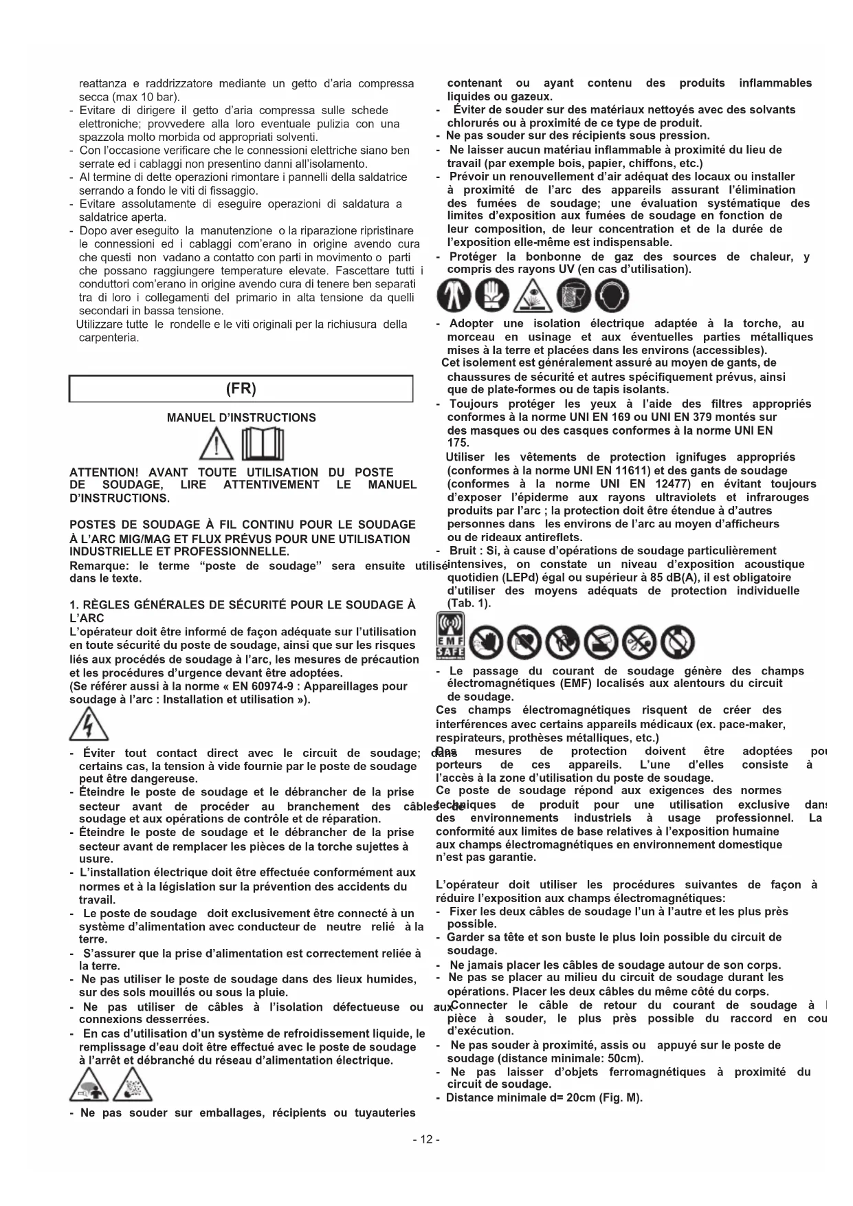 Utiliser les vêtements de protection ignifuges appropriés (conformesàlanormeUNIEN11611)etdesgantsdesoudage (conformes à la norme UNI EN 12477) en évitant toujours d’exposer l’épiderme aux rayons ultraviolets et infrarouges produitsparl’arc;laprotectiondoitêtreétendueàd’autres personnesdans lesenvironsdel’arcaumoyend’afcheurs ouderideauxantireets. - Bruit:Si,àcaused’opérationsdesoudageparticulièrement intensives, on constate un niveau d’exposition acoustique quotidien(LEPd)égalousupérieurà85dB(A),ilestobligatoire d’utiliser des moyens adéquats de protection individuelle (Tab. 1). - Le passage du courant de soudage génère des champs électromagnétiques (EMF) localisés aux alentours du circuit de soudage. Ces champs électromagnétiques risquent de créer des interférencesaveccertainsappareilsmédicaux(ex.pace-maker, respirateurs,prothèsesmétalliques,etc.) Des mesures de protection doivent être adoptées pour les porteurs de ces appareils. L’une d’elles consiste à interdire l’accèsàlazoned’utilisationdupostedesoudage. Ce poste de soudage répond aux exigences des normes techniques de produit pour une utilisation exclusive dans des environnements industriels à usage professionnel. La conformitéauxlimitesdebaserelativesàl’expositionhumaine auxchampsélectromagnétiquesenenvironnementdomestique n’est pas garantie. L’opérateur doit utiliser les procédures suivantes de façon à réduirel’expositionauxchampsélectromagnétiques: - Fixerlesdeuxcâblesdesoudagel’unàl’autreetlesplusprès possible. - Garder sa tête et son buste le plus loin possible du circuit de soudage. - Nejamaisplacerlescâblesdesoudageautourdesoncorps. - Ne pas se placer au milieu du circuit de soudage durant les opérations.Placerlesdeuxcâblesdumêmecôtéducorps. - Connecter le câble de retour du courant de soudage à la pièce à souder, le plus près possible du raccord en cours d’exécution. - Nepassouderàproximité,assisou appuyésurlepostede soudage(distanceminimale:50cm). - Ne pas laisser d’objets ferromagnétiques à proximité du circuit de soudage. - Distance minimale d= 20cm (Fig. M).- 13 - - AppareilsdeclasseA: Ce poste de soudage répond aux exigences de la norme technique de produit pour une utilisation exclusive dans des environnements industriels à usage professionnel. La conformité à la compatibilité électromagnétique dans les immeubles domestiques et dans ceux directement raccordés àunréseaud’alimentationbassetensiondesimmeublespour usage domestique n’est pas garantie.