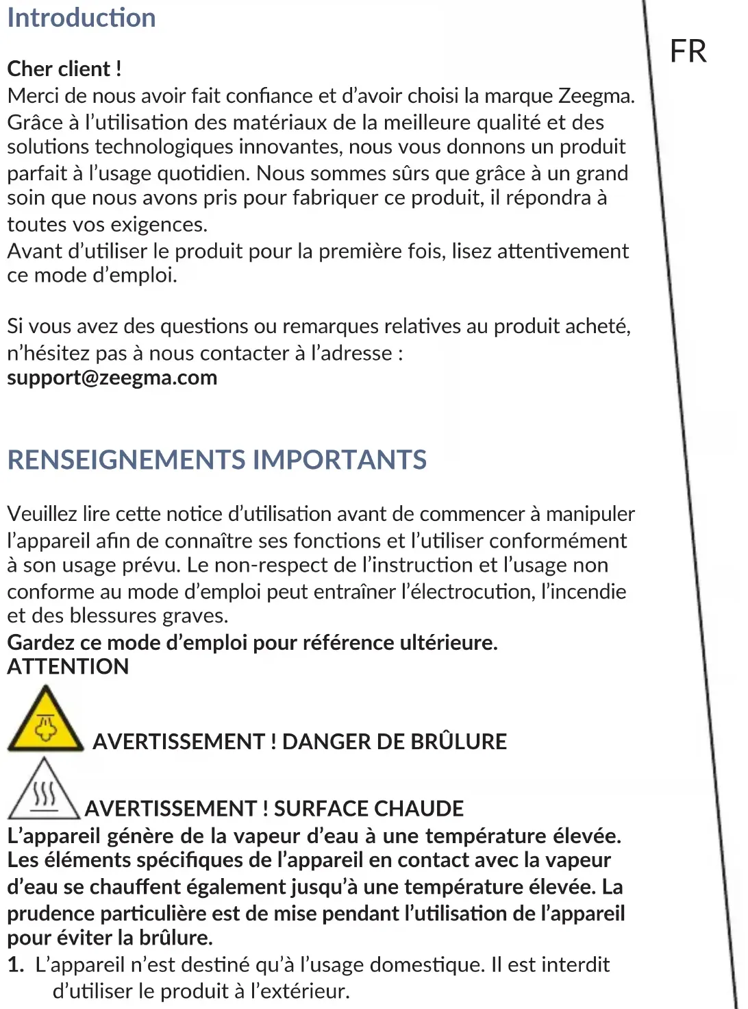 Pulire il pulitore a vapore portale, il tubo e la testa con un panno morbido e asciuo. Le foto sono solo a scopo illustravo, l’aspeo reale dei prodo può dierire da quelli presenta nelle immagini.FR Introducon Cher client ! Merci de nous avoir fait conance et d’avoir choisi la marque Zeegma. Grâce à l’ulisaon des matériaux de la meilleure qualité et des soluons technologiques innovantes, nous vous donnons un produit parfait à l’usage quodien. Nous sommes sûrs que grâce à un grand soin que nous avons pris pour fabriquer ce produit, il répondra à toutes vos exigences. Avant d’uliser le produit pour la première fois, lisez aenvement ce mode d’emploi. Si vous avez des quesons ou remarques relaves au produit acheté, n’hésitez pas à nous contacter à l’adresse : support@zeegma.com RENSEIGNEMENTS IMPORTANTS Veuillez lire cee noce d’ulisaon avant de commencer à manipuler l’appareil an de connaître ses foncons et l’uliser conformément à son usage prévu. Le non-respect de l’instrucon et l’usage non conforme au mode d’emploi peut entraîner l’électrocuon, l’incendie et des blessures graves. Gardez ce mode d’emploi pour référence ultérieure. ATTENTION