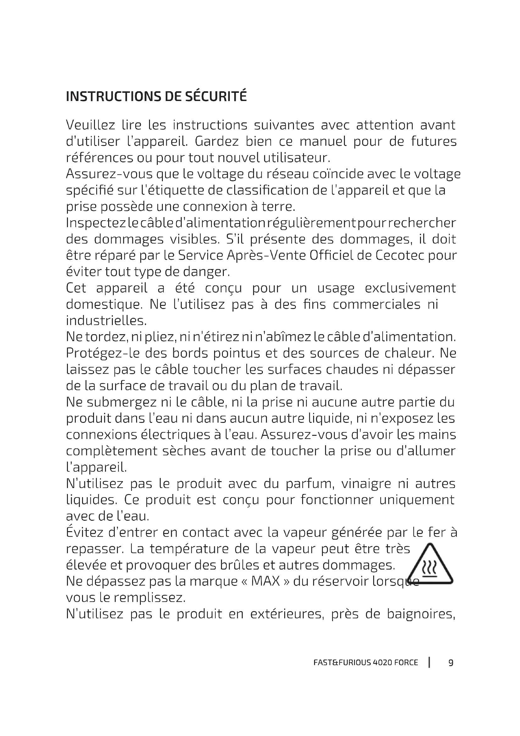 Veuillez lire les instructions suivantes avec attention avant d’utiliser l’appareil. Gardez bien ce manuel pour de futures références ou pour tout nouvel utilisateur. Assurez-vous que le voltage du réseau coïncide avec le voltage spécié sur l’étiquette de classication de l’appareil et que la prise possède une connexion à terre. Inspectez le câble d’alimentation régulièrement pour rechercher des dommages visibles. S’il présente des dommages, il doit être réparé par le Service Après-Vente Ofciel de Cecotec pour éviter tout type de danger. Cet appareil a été conçu pour un usage exclusivement domestique. Ne l’utilisez pas à des ns commerciales ni industrielles. Ne tordez, ni pliez, ni n’étirez ni n’abîmez le câble d’alimentation. Protégez-le des bords pointus et des sources de chaleur. Ne laissez pas le câble toucher les surfaces chaudes ni dépasser de la surface de travail ou du plan de travail. Ne submergez ni le câble, ni la prise ni aucune autre partie du produit dans l’eau ni dans aucun autre liquide, ni n’exposez les connexions électriques à l’eau. Assurez-vous d’avoir les mains complètement sèches avant de toucher la prise ou d’allumer l’appareil. N’utilisez pas le produit avec du parfum, vinaigre ni autres liquides. Ce produit est conçu pour fonctionner uniquement avec de l’eau. Évitez d’entrer en contact avec la vapeur générée par le fer à repasser. La température de la vapeur peut être très élevée et provoquer des brûles et autres dommages. Ne dépassez pas la marque « MAX » du réservoir lorsque vous le remplissez. N’utilisez pas le produit en extérieures, près de baignoires,10