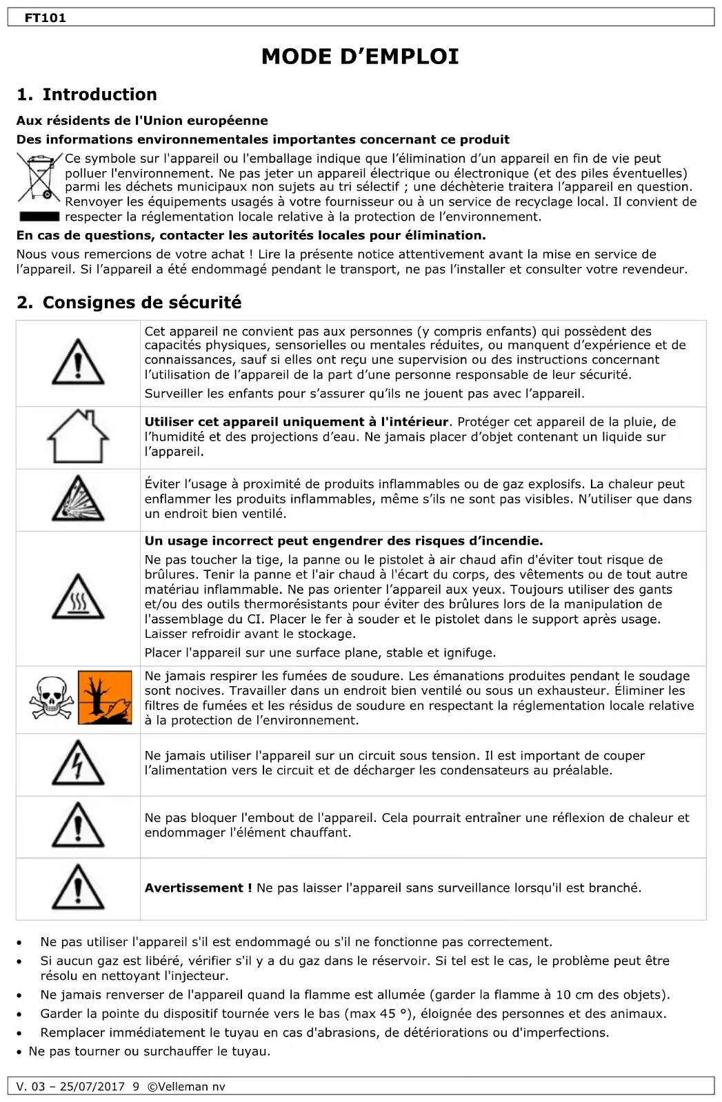 Ne pas utiliser l'appareil s'il est endommagé ou s'il ne fonctionne pas correctement. Si aucun gaz est libéré, vérifier s'il y a du gaz dans le réservoir. Si tel est le cas, le problème peut être résolu en nettoyant l'injecteur. Ne jamais renverser de l'appareil quand la flamme est allumée (garder la flamme à 10 cm des objets). Garder la pointe du dispositif tournée vers le bas (max 45 °), éloignée des personnes et des animaux. Remplacer immédiatement le tuyau en cas d'abrasions, de détériorations ou d'imperfections. Ne pas tourner ou surchauffer le tuyau.FT101