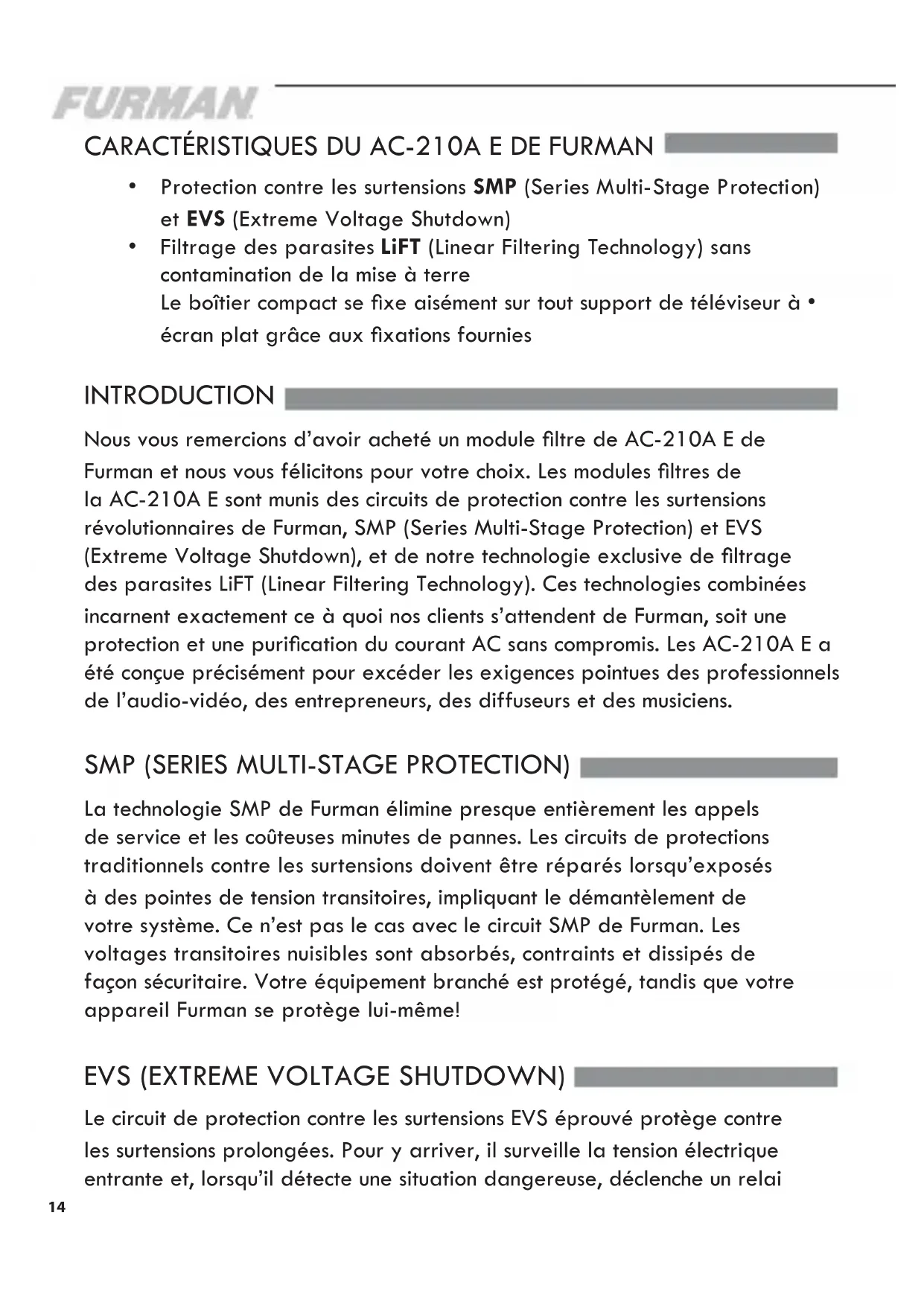 DEUTSCH РУССКИЙ14 CARACTÉRISTIQUES DU AC-210A E DE FURMAN Protection contre les surtensions • SMP (Series Multi-Stage Protection) et EVS (Extreme Voltage Shutdown) Filtrage des parasites • LiFT (Linear Filtering Technology) sans contamination de la mise à terre Le boîtier compact se xe aisément sur tout support de téléviseur à • écran plat grâce aux xations fournies INTRODUCTION Nous vous remercions d’avoir acheté un module ltre de AC-210A E de Furman et nous vous félicitons pour votre choix. Les modules ltres de la AC-210A E sont munis des circuits de protection contre les surtensions révolutionnaires de Furman, SMP (Series Multi-Stage Protection) et EVS (Extreme Voltage Shutdown), et de notre technologie exclusive de ltrage des parasites LiFT (Linear Filtering Technology). Ces technologies combinées incarnent exactement ce à quoi nos clients s’attendent de Furman, soit une protection et une purication du courant AC sans compromis. Les AC-210A E a été conçue précisément pour excéder les exigences pointues des professionnels de l’audio-vidéo, des entrepreneurs, des diffuseurs et des musiciens. SMP (SERIES MULTI-STAGE PROTECTION) La technologie SMP de Furman élimine presque entièrement les appels de service et les coûteuses minutes de pannes. Les circuits de protections traditionnels contre les surtensions doivent être réparés lorsqu’exposés à des pointes de tension transitoires, impliquant le démantèlement de votre système. Ce n’est pas le cas avec le circuit SMP de Furman. Les voltages transitoires nuisibles sont absorbés, contraints et dissipés de façon sécuritaire. Votre équipement branché est protégé, tandis que votre appareil Furman se protège lui-même! EVS (EXTREME VOLTAGE SHUTDOWN) Le circuit de protection contre les surtensions EVS éprouvé protège contre les surtensions prolongées. Pour y arriver, il surveille la tension électrique entrante et, lorsqu’il détecte une situation dangereuse, déclenche un relaiFRANÇAIS ENGLISH ESpAÑoL