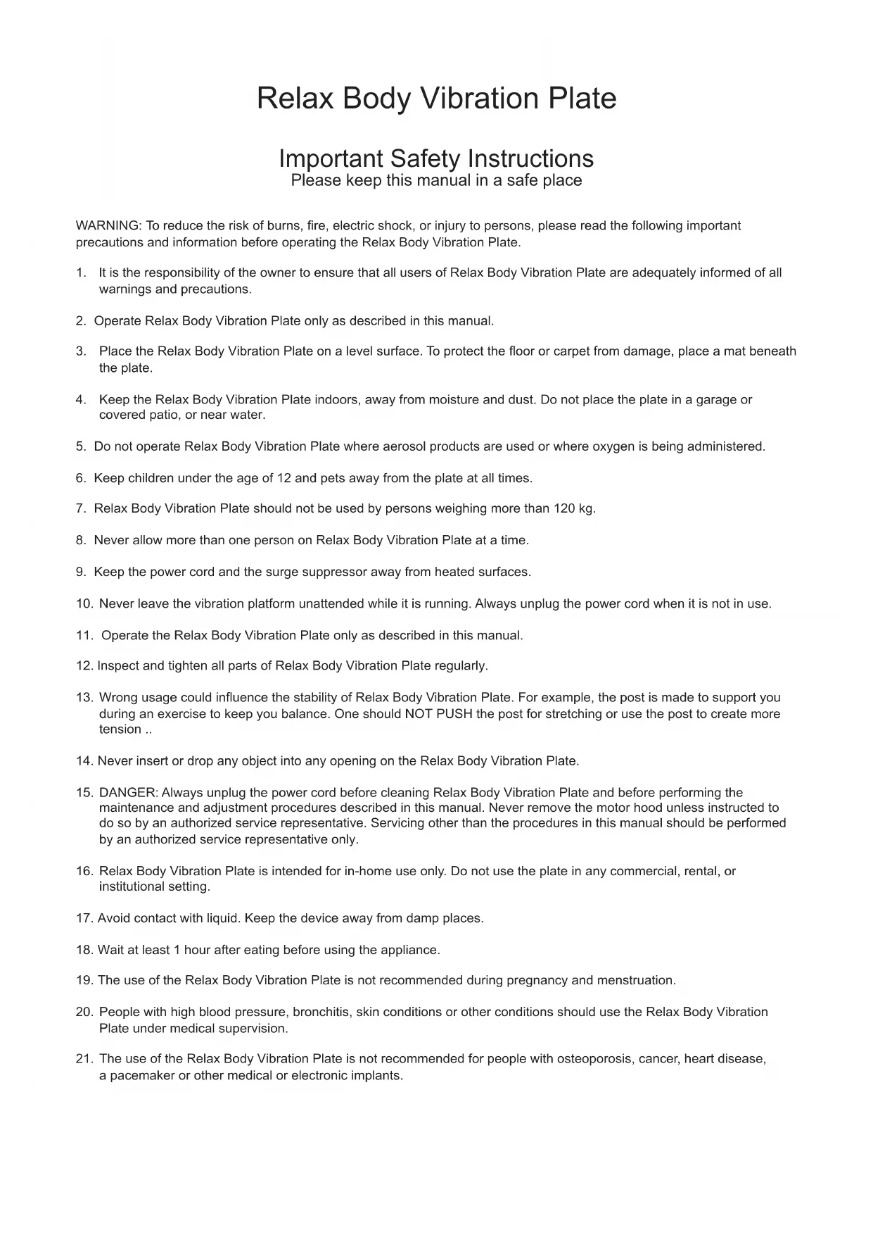 8. Ne laissez jamais plus d’une personne sur la plaque Relax Body Vibration à la fois.