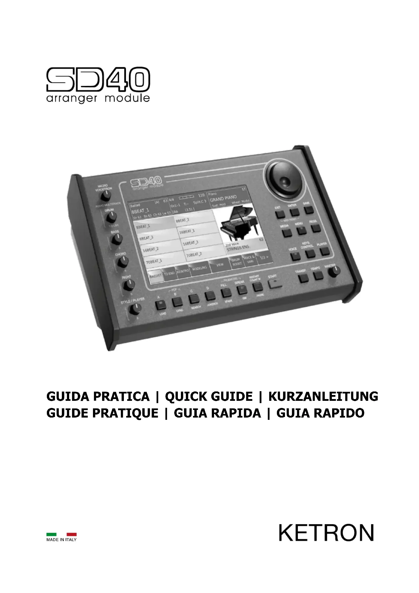 “ExécutiondesDirectives2002/95/CE,2002/96/CEet2003/108/CE,concernantlaréductiondel’utilisationdesubstances dangereusesdanslesappareilsélectriquesetélectroniquesetl’éliminationdesdéchets”. Lesymboleduconteneurbarrémarquésurl’appareilindiquequeleproduitàlandesavieutiledoitêtrecollectéséparément desautresdéchets.Parconséquentl’utilisateurdevra collecter l’appareil inutilisable dans un centre de collecte sélective approprié de déchets électroniques et électrotechniques ou bien ildevra le remettreau revendeur en cas d’achat d’un nouvelappareildetypepareil,enraisond’uncontreun.Unecollectesélectiveadéquateetleconséquentenvoidel’appareil inutilisable au recyclage, au traitement et à son correcte élimination contribue à éviter de possibles effets négatifs sur l’environnementetsurlasantéetellefavoriselerecyclagedesmatièresdontl’appareilestcomposé.L’éliminationabusivedu produitparl’utilisateurcomportel’applicationdessanctionsadministrativesprévues. Ce symbole indique que dans les pays de l’Union européenne, ce produit doit être collecté séparément des ordures ménagères selon les directives en vigueur dans chacun de ces pays. Les produits portant ce symbole ne doivent pas être mis au rebut avec les ordures ménagères./18 CONNEXIONS DC 9V 4A Prise d’alimentation du courant électrique. Onconseilled’utiliserexclusivementl’alimentateur fourniavecl’instrument.Output:9V,4A. ON/OFF Bouton poussoir d’activation/désactivation. Lamiseenmarchedel’instrumentpeut demanderjusqu’à30secondes.Pourarrêtercorrectementl’instrument,enfoncerlatouche ON/OFFetattendresacomplètedésactivation.Cetteopérationpeutdemanderjusqu’à 10secondes. VOLUME PEDAL Prisejackstéréostandardpourlaconnexiond’unepédaledeVolume(optionnelle). VIDEO DVI Prisevidéonumérique(DigitalVideoInterface)pourlaconnexiond’unécranexterne. USB DEVICE ConnexionUSBdevicepourordinateuroud’autresdispositifsenmesuredegérerSD40 commeuneunitéamovibleexterne. FOOTSWITCH Prisemultipolairestandardpourlaconnexiond’unepédaleoptionnellepourlecontrôledecertaines fonctionsinternes.CompatibleavecKetronFS6/FS13. MIDI PrisepourlaconnexionMIDIIN1(GM),MIDIIN2(Key),MIDIOUTetMIDITHRU. MAIN OUT Prisejackmonostandardpourlasortiegénéraleàconnecteravecuneinstallation PASTEREO:gauche(LeftMono),droite(RightMono).Nousvousconseillonsvivement d’employerlaconnexionsstéréopouruneparfaitereproductiondel’instrumentetdesesEfx. UneéventuelleconnexionMono(c’est-à-direl’emploid’uneseulesortieLeftouRight)produira unereproductionquinereètepaslespropriétésqualitativesdessonsetdesEfx. HEADPHONE LevolumeducasqueserajustementcontrôléparlasectionMaster. MICRO 1 IN Prisecombo(Jack/XLR)monostandardpourlaconnexiond’unmicrophonedynamique. MICRO 1 GAIN PotentiomètrepourleréglagedugaindusignalenentréeàlapriseMicro1. MICRO 1 OUT PrisejackmonostandardconsacréeexclusivementàlasortieMicro1. MICRO 2 IN Prisejackmonostandardpourlaconnexiond’uninstrumentsupplémentaire,(Keyboard, Expandeur),GuitareouMicrophonedynamique. Surlapartiedroitedel’instrumentnoustrouvonsunslotpourl’introdution delaCarte SD et 3 USB Host pourlaconnexionavecdesdispositifs USBexternestelsqueclémémoireHDalimente’,etc./19 ESPAÑOL Bienvenidos! Gracias por la compra del Ketron SD40! Estabreveguiadescribelasoperacionesbásicasparaparalapuestaenmarcha delmòdulo,lasconexionesylasadvertenciasdeseguridad.Serecomiendaleer elmanualdeinstruccionesenformatoHTMLdisponibleeneldispositivoUSB paraobtenerelmaximorendimientoyecienciaparasuusoeneldirectoyen elestudio. ElmismomanualenHTMLtambiénestádisponibleenelsitiowebwww.ketron. itdondesepuedeencontrarmásinformacióndelasutilidadesrelacionadascon elSD40. SD40revolucionacompletamentelaformadeusograciasalanuevapantalla táctil de grandes dimensiones y a color. La mayoría de las funciones, sonfacilmenteaccesiblesconel“toquedeundedo”directamenteenlapantalla, encorrespondenciadesusbotones./20