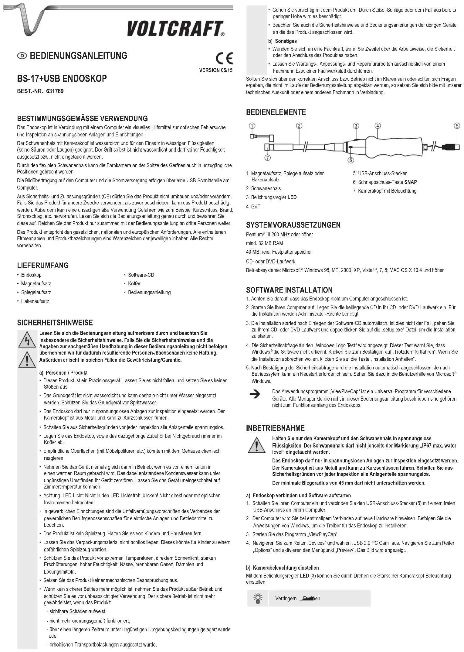 Cet endoscope est une aide visuelle qui, combinée à un ordinateur, permet d’inspecter et de diagnostiquer optiquement les défauts des systèmes et équipements hors tension. Le col de cygne ainsi que la sonde sont étanches et peuvent être utilisés dans des liquides aqueux (mais pas dans des acides ou dans des solutions alcalines). La poignée elle-même n’est pas étanche et ne doit pas être exposée aux liquides ou être immergée. Grâce à son col de cygne exible, la caméra couleur installée à l’extrémité de l’appareil permet d’atteindre des endroits inaccessibles. Une interface USB sur l’ordinateur permet le transfert des images à l’ordinateur et l’alimentation de l’appareil en courant. Pour des raisons de sécurité et d’homologation (CE), toute transformation et/ou modication du produit est interdite. Si vous utilisez le produit à d’autres ns que celles décrites précédemment, cela risque d’endommager le produit. Par ailleurs, une utilisation incorrecte peut être source de dangers tels que court-circuit, incendie, électrocution. Lisez attentivement le mode d’emploi et conservez le. Ne transmettez le produit à des tiers qu’accompagné de son mode d’emploi. Le produit est conforme aux exigences des directives européennes et nationales en vigueur. Tous les noms d’entreprises et appellations de produits contenus dans ce mode d’emploi sont des marques déposées des propriétaires correspondants. Tous droits réservés.