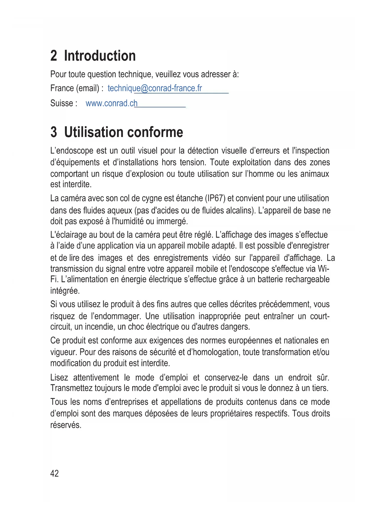 2 Introduction Pour toute question technique, veuillez vous adresser à: France (email) : technique@conrad-france.fr Suisse : www.conrad.ch 3 Utilisation conforme L’endoscope est un outil visuel pour la détection visuelle d’erreurs et l'inspection d’équipements et d’installations hors tension. Toute exploitation dans des zones comportant un risque d’explosion ou toute utilisation sur l’homme ou les animaux est interdite. La caméra avec son col de cygne est étanche (IP67) et convient pour une utilisation dans des uides aqueux (pas d'acides ou de uides alcalins). L’appareil de base ne doit pas exposé à l'humidité ou immergé. L'éclairage au bout de la caméra peut être réglé. L’afchage des images s’effectue à l’aide d’une application via un appareil mobile adapté. Il est possible d'enregistrer et de lire des images et des enregistrements vidéo sur l'appareil d'afchage. La transmission du signal entre votre appareil mobile et l'endoscope s'effectue via Wi- Fi. L’alimentation en énergie électrique s’effectue grâce à un batterie rechargeable intégrée. Si vous utilisez le produit à des ns autres que celles décrites précédemment, vous risquez de l’endommager. Une utilisation inappropriée peut entraîner un court- circuit, un incendie, un choc électrique ou d'autres dangers. Ce produit est conforme aux exigences des normes européennes et nationales en vigueur. Pour des raisons de sécurité et d’homologation, toute transformation et/ou modication du produit est interdite. Lisez attentivement le mode d’emploi et conservez-le dans un endroit sûr. Transmettez toujours le mode d'emploi avec le produit si vous le donnez à un tiers. Tous les noms d’entreprises et appellations de produits contenus dans ce mode d’emploi sont des marques déposées de leurs propriétaires respectifs. Tous droits réservés.43 4 Caractéristiques et fonctions