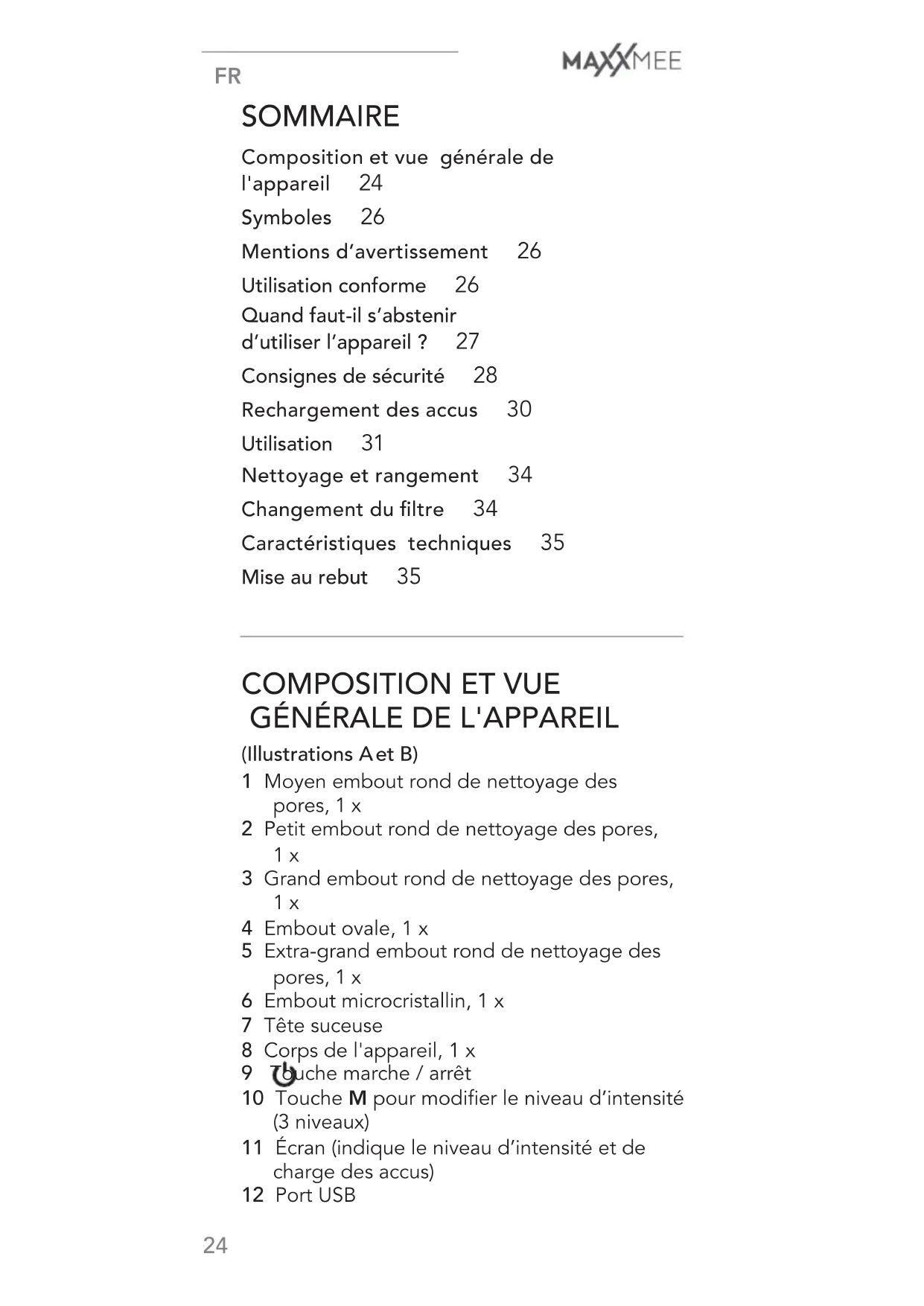 Un adaptateur secteur USB est par ailleurs requis pour le chargement sur une prise. Celui-ci n'est pas inclus à la livraison. Chère cliente, cher client, Nous vous félicitons d'avoir fait l'acquisition de l’appareil de nettoyage des pores Pro MAXXMEE. Il extrait rapidement et en douceur boutons, points noirs et impuretés par le vide, une technologie moderne et efficace. 6embouts et 3niveaux d’intensité permettent une applica- tion optimale pour chaque zone et chaque type de peau. L’embout microcristallin favorise par ailleurs la régénération naturelle de l’épiderme: les cellules mortes et les peaux mortes sont éliminées et le tissu sous-jacent peut produire de nouvelles cellules cutanées, de l’élastine et du collagène. Pour toute question concernant cet appareil et ses pièces de rechange et accessoires, veuillez contacter le service après-vente à partir de notre site Web: www.dspro.de/kundenservice Nous espérons que votre appareil de nettoyage des pores Pro MAXXMEE vous donnera entière satisfaction!FR