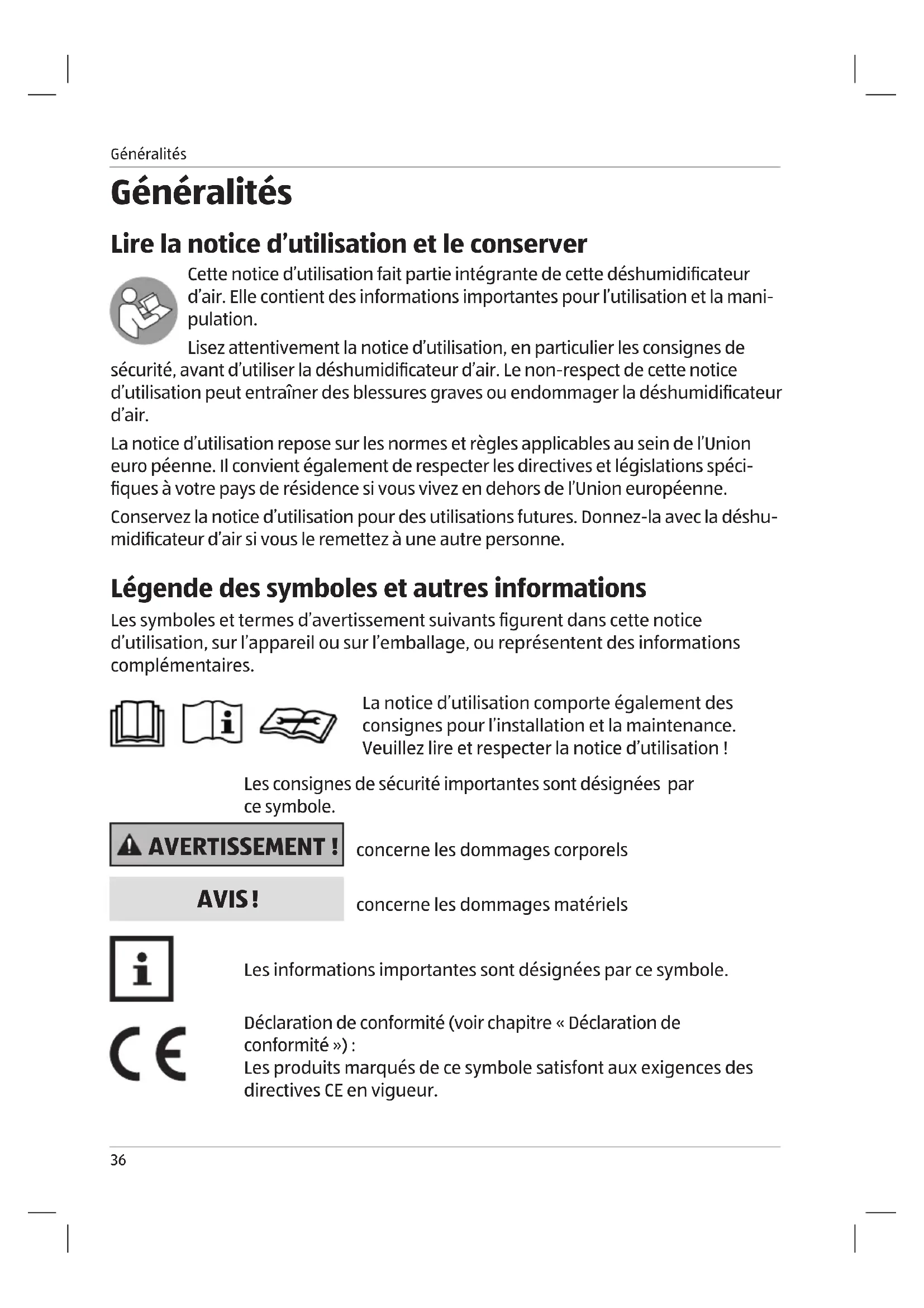 - Aller rapidement et facilement au but avec les codes QR Généralités Lire la notice d’utilisation et le conserver Cette notice d’utilisation fait partie intégrante de cette déshumidificateur d’air. Elle contient des informations importantes pour l’utilisation et la mani- pulation. Lisez attentivement la notice d’utilisation, en particulier les consignes de sécurité, avant d’utiliser la déshumidificateur d’air. Le non-respect de cette notice d’utilisation peut entraîner des blessures graves ou endommager la déshumidificateur d’air. La notice d’utilisation repose sur les normes et règles applicables au sein de l’Union euro péenne. Il convient également de respecter les directives et législations spéci- fiques à votre pays de résidence si vous vivez en dehors de l’Union européenne. Conservez la notice d’utilisation pour des utilisations futures. Donnez-la avec la déshu- midificateur d’air si vous le remettez à une autre personne. Légende des symboles et autres informations Les symboles et termes d’avertissement suivants figurent dans cette notice d’utilisation, sur l’appareil ou sur l’emballage, ou représentent des informations complémentaires. La notice d’utilisation comporte également des consignes pour l’installation et la maintenance. Veuillez lire et respecter la notice d’utilisation ! Les consignes de sécurité importantes sont désignées par ce symbole. AVERTISSEMENT! concerne les dommages corporels AVIS ! concerne les dommages matériels Les informations importantes sont désignées par cesymbole. Déclaration de conformité (voir chapitre «Déclaration de conformité»): Les produits marqués de ce symbole satisfont aux exigences des directives CE en vigueur. Généralités37 Généralités Le label «Geprüfte Sicherheit» (Sécurité contrôlée) certifie que cet appareil peut être utilisé en toute sécurité dans des conditions d’utilisation prévisibles. Le label atteste que cet appareil est con- forme à la loi sur la sécurité des produits. Ce symbole fait référence aux prescriptions spéciales en matière d’élimination des appareils usagés (voir le chapitre«Élimination»). Attention, risque d’incendie!38 Sécurité Utilisation conforme à l’usage prévu L’appareil est exclusivement réservé à la déshumidification de pièces fermées. De plus, l’appareil n’est pas destiné à une utilisation professionnelle mais uniquement à une utilisation privée. Toute autre utilisation ou modification de l’appareil n’est pas conforme et est strictement interdite. Nous ne pou- vons être tenus responsables des dommages survenus à la suite d’une utilisation non conforme ou incorrecte. Ce produit est répertorié parmi les appareils accessibles au grand public. Consignes de sécurité AVERTISSEMENT ! Veuillez lire et respecter les consignes de sécurité énoncées ci-après. Le non-respect de ces consignes peut engendrer des risques d’accident et de blessures, ainsi que des dommages matériels ou des dysfonctionnements de l’appareil. Risques pour les enfants et les personnes dont les facultés sont limitées - Les enfants âgés de plus de 8ans et les personnes dont les facultés physiques, sensorielles ou mentales sont limitées ou les personnes manquant d’expérience et/ou de connaissances sont autorisés à utiliser cet appareil, à condition qu’ils soient surveillés ou qu’ils aient été instruits quant à son usage sûr et qu’ils aient compris les dangers en résultant. - Les enfants n’ont pas le droit de procéder au nettoyage et l’entretien de l’appareil, sauf s’ils sont sous surveillance. Les Sécurité39 Sécurité enfants de moins de 8ans doivent être tenus à distance de l’appareil et du cordon. - Les enfants ne doivent pas jouer avec l’appareil. Les enfants ne sont pas conscients du danger inhérent à l’utilisation d’appareils électriques. Par conséquent, utilisez et conservez l’appareil hors de portée des enfants de moins de 8ans. Ne laissez pas pendre le cordon électrique afin d’éviter que quelqu’un ne tire dessus. - Conservez l’emballage hors de portée des enfants. Risqued’asphyxie! Risques liés à l’utilisation d’appareils électriques - Branchez l’appareil uniquement sur une prise secteur avec terre installée de manière conforme et dont la tension de secteur respecte la plaque signalétique. - Si le cordon électrique est endommagé, seul un atelier spé- cialisé désigné par le constructeur est autorisé à le rempla- cer afin d’éviter tout risque de blessure, d’accident ou de dégâts à l’appareil. - Veillez à ce que la prise secteur avec terre se trouve à proxi- mité de l’appareil et soit facilement accessible de façon à ce que l’appareil puisse être rapidement débranché en cas d’accident. - Seuls des ateliers spécialisés et habilités sont autorisés à effectuer les réparations. Les appareils réparés par un per- sonnel non spécialisé représentent un danger pour l’utilisa- teur. - Afin d’éviter tout accident, ne laissez pas l’appareil sans sur- veillance pendant qu’il fonctionne. - Afin d’éviter tout accident, n’utilisez jamais la même prise secteur avec terre pour brancher simultanément plusieurs appareils ménagers (par exemple sur une triplite).40 Sécurité - Ne plongez jamais l’appareil dans l’eau et ne l’utilisez pas en plein air, car ce dernier ne doit en aucun cas être exposé à la pluie ou à l’humidité. Risque d’électrocution! - Si l’appareil venait à tomber dans l’eau, débranchez d’abord la prise avant de le sortir de l’eau! Ne remettez pas l’appareil en service avant de l’avoir fait contrôler par un SAV agréé. Ceci vaut également lorsque le câble d’alimentation ou l’appareil est endommagé ou si l’appareil est tombé. Risque d’électrocution! - Débranchez toujours la prise lorsque l’appareil n’est pas utilis