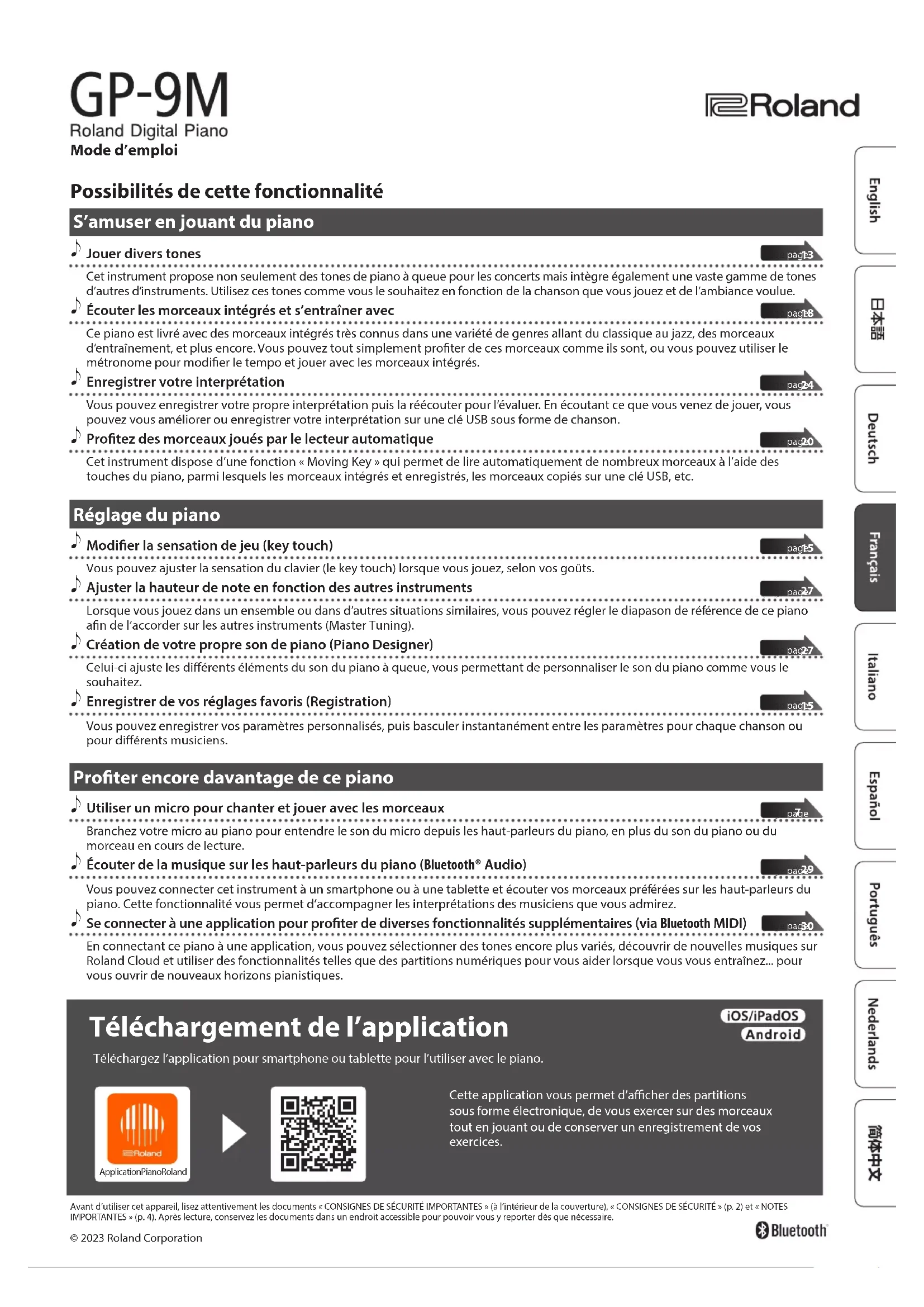 Se connecter à une application pour proter de diverses fonctionnalités supplémentaires (via Bluetooth MIDI) En connectant ce piano à une application, vous pouvez sélectionner des tones encore plus variés, découvrir de nouvelles musiques sur Roland Cloud et utiliser des fonctionnalités telles que des partitions numériques pour vous aider lorsque vous vous entraînez... pour vous ouvrir de nouveaux horizons pianistiques.page page 1313page page 1818page page 2424page page 2020page page 1515page page 2727page page 2727page page 1515page page 77page page 2929page page 3030© 2023 Roland CorporationCette application vous permet d’acher des partitions sous forme électronique, de vous exercer sur des morceaux tout en jouant ou de conserver un enregistrement de vos exercices. Téléchargement de l’application Téléchargez l’application pour smartphone ou tablette pour l’utiliser avec le piano.Application Piano Roland Mode d’emploi22