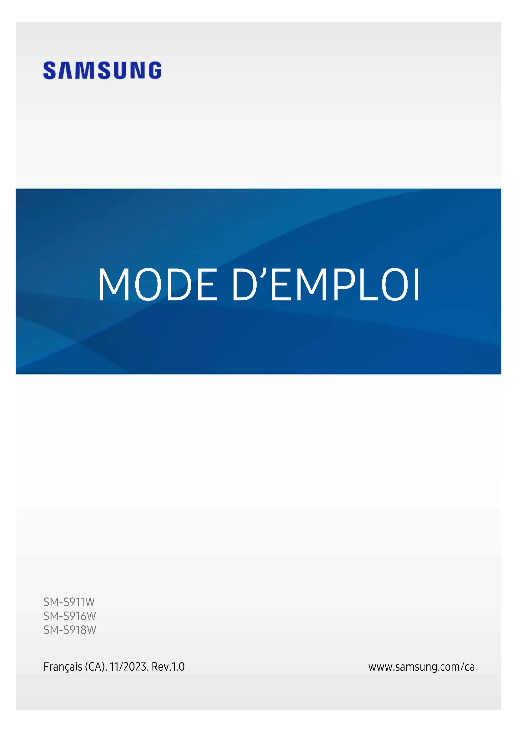 Français (CA). 11/2023. Rev.1.0 SM-S911W SM-S916W SM-S918W2 Table des matières Démarrage 6 Présentation de l’appareil et de ses fonctions 12 Charger la pile 17 Cartes nano-SIM et eSIM 19 Allumer et éteindre l’appareil 20 Configuration initiale Applications et fonctionnalités 21 Introduction 22 Compte Samsung 23 Présentation de l’écran 32 Panneau de notifications 34 Saisir du texte 35 Installer ou désinstaller des applications 37 Téléphone 39 Contacts 41 Messages 43 Fonction multifenêtre 45 Bixby 47 Bixby Vision 48 Samsung Internet 49 Samsung Kids 50 Samsung Health 51 Samsung Members 51 Samsung Global Goals 51 Samsung TV Plus 51 Galaxy Wearable 52 Calendrier 52 Reminder 53 Mes fichiers 53 Horloge 54 Calculatrice 54 Gaming Hub 55 Game Booster 56 SmartThings 56 Smart View 57 Music Share 59 Lien avec Windows 60 Samsung DeX 64 Applications Google 65 Stylet S Pen (Galaxy S23 Ultra) 80 Samsung Notes 84 PENUP (Galaxy S23 Ultra) 85 Appareil photo 103 Galerie 107 Zone RA 112 Dictaphone 114 Samsung Wallet 118 Partager du contenu 120 Capturer et enregistrer l’écran 122 Transférer des données depuis votre ancien appareil (Smart Switch)Table des matières