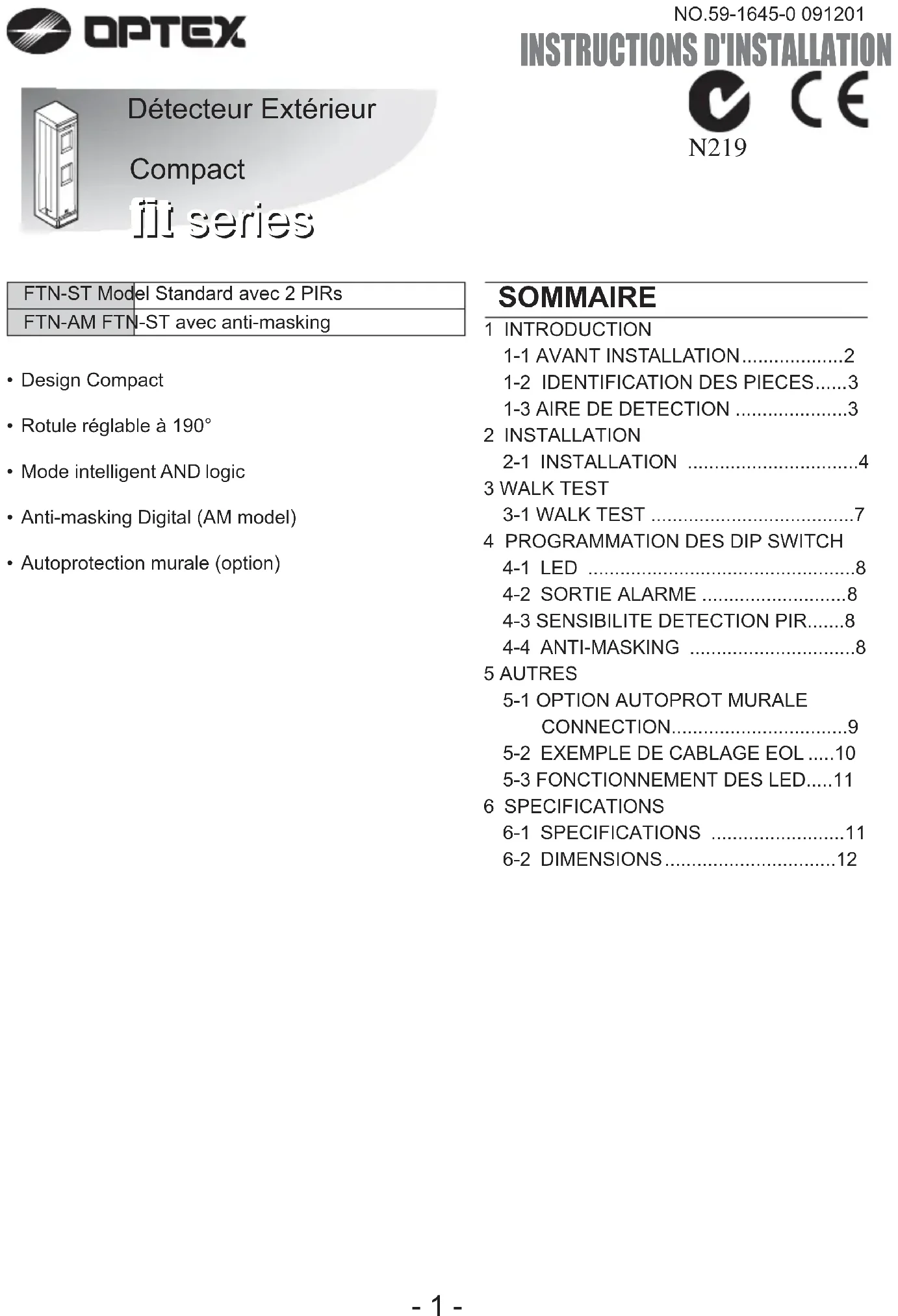 NO.59-1645-0 091201 INSTRUCTIONS D'INSTALLATION Détecteur Extérieur Compact fit series fit series - 1 -1 INTRODUCTION 1-1 AVANT INSTALLATION Danger Ne pas suivre ces instructions peuvent blesser ou causer la mort Attention Ne pas suivre ces instructions peuvent blesser gravement Le signe indique les recommandations