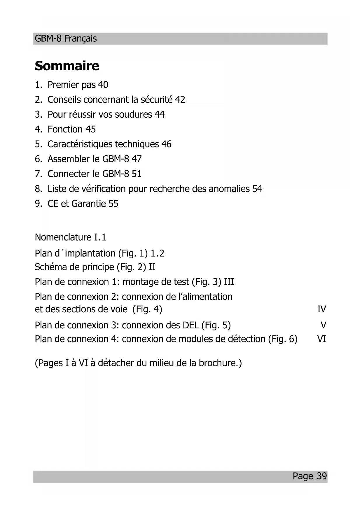 Nomenclature I.1 Plan d´implantation (Fig. 1) 1.2 Schéma de principe (Fig. 2) II Plan de connexion 1: montage de test (Fig. 3) III Plan de connexion 2: connexion de l’alimentation et des sections de voie (Fig. 4) IV Plan de connexion 3: connexion des DEL (Fig. 5) V Plan de connexion 4: connexion de modules de détection (Fig. 6) VI (Pages I à VI à détacher du milieu de la brochure.)Français GBM-8 Page 40