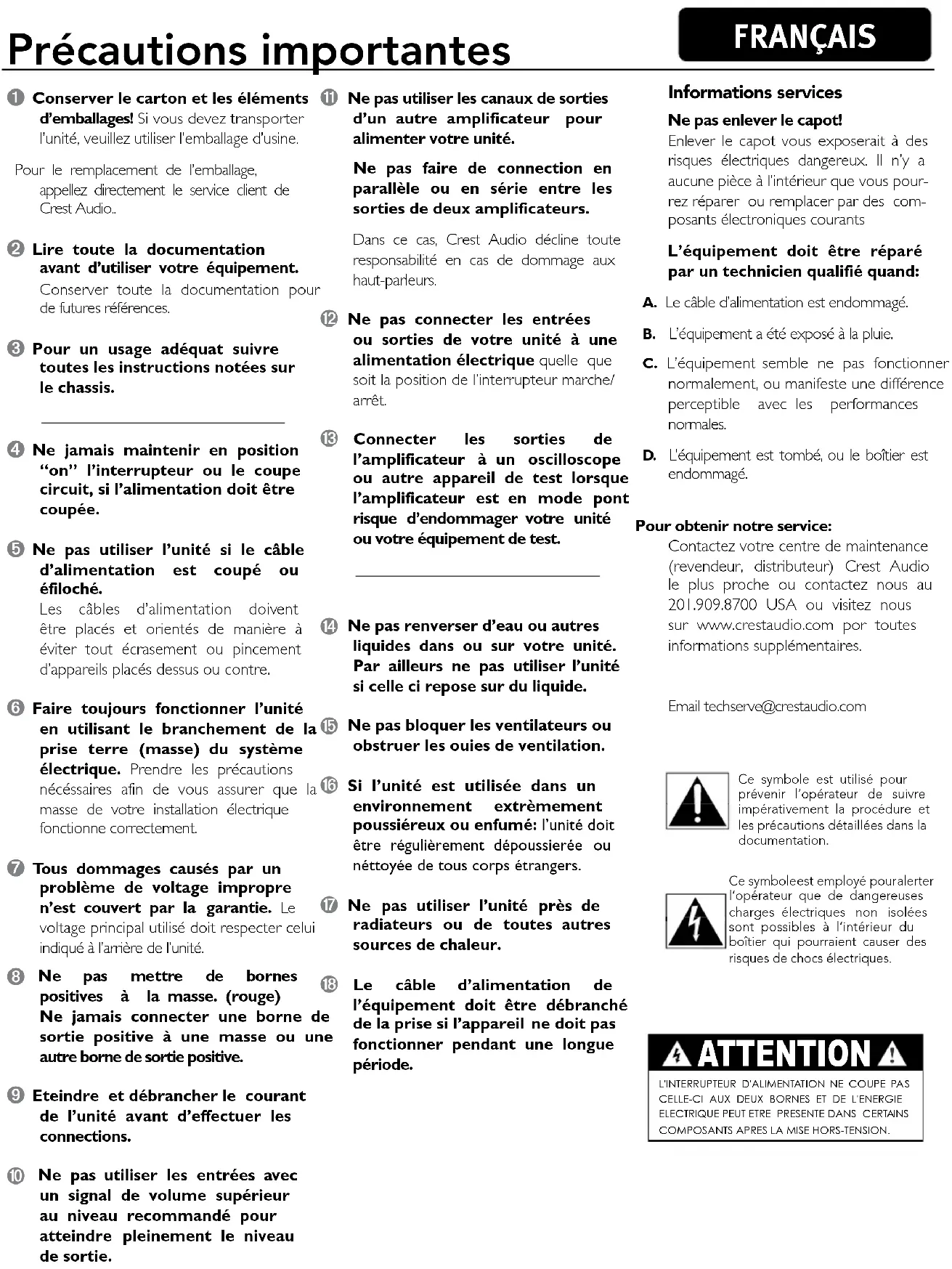 Pour obtenir notre service: Contactez votre centre de maintenance (revendeur, distributeur) Crest Audio le plus proche ou contactez nous au 201.909.8700 USA ou visitez nous sur www.crestaudio.com por toutes informations supplémentaires.Email techserve@crestaudio.comCe symbole est utilisé pour prévenir l’opérateur de suivre impérativement la procédure et les précautions détaillées dans la documentation.Ce symbole est employé pour alerter l’opérateur que de dangereuses charges électriques non isolées sont possibles à l’intérieur du boîtier qui pourraient causer des risques de chocs électriques. Précautions importantes ATTENTION L'INTERRUPTEUR D'ALIMENTAT ION NE COUPE PA S CELLE-CI AUX DEUX BORNES ET DE L'ENERGIE ELECTRIQUE PEUT ETRE PRESENTE DANS CERTAINS COMPOSANTS APRES LA MISE HORS-TENSION. FRANÇAISp. 40 Table des matières