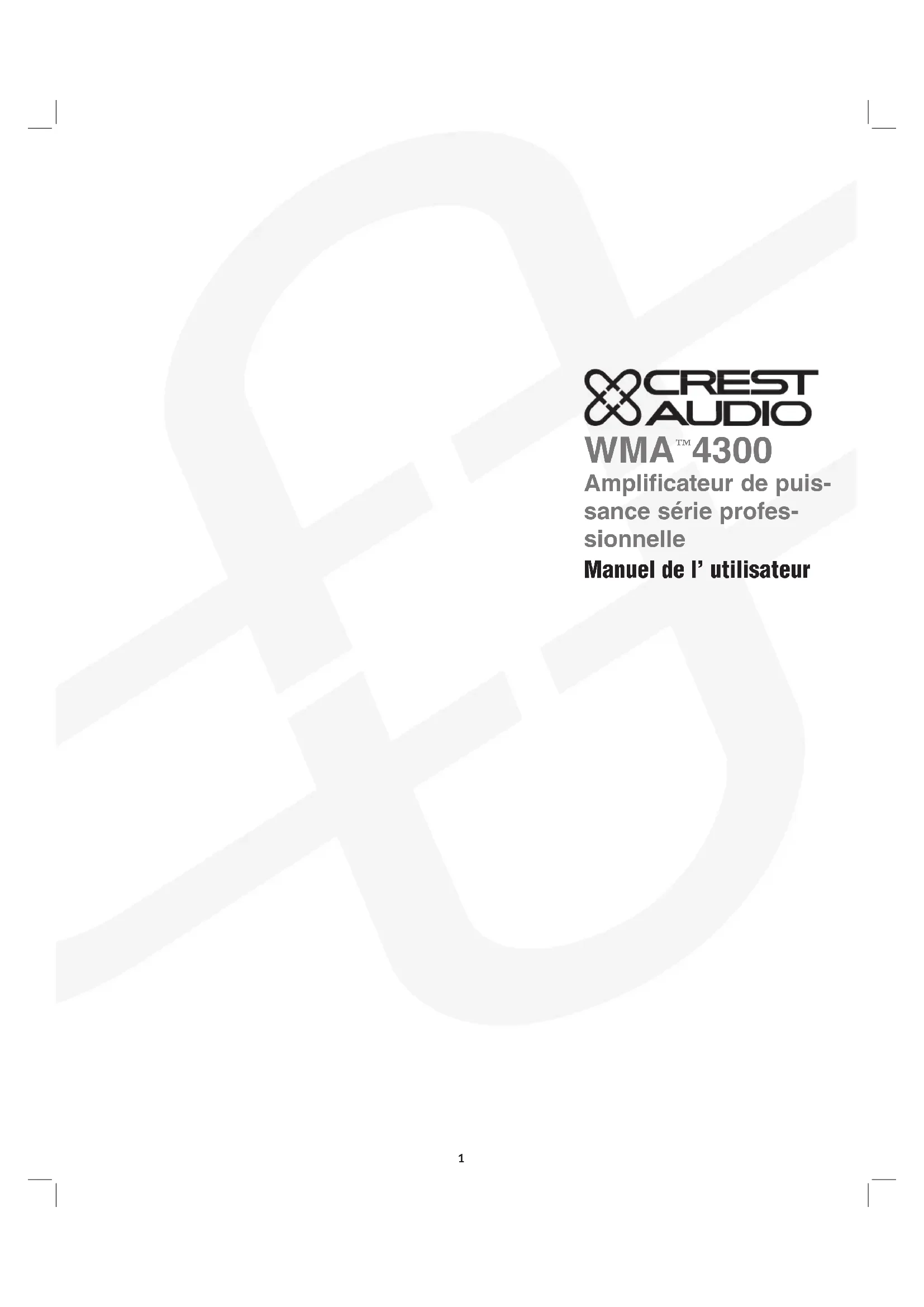 WMA™4300 Amplificateur de puis- sance série profes- sionnelle Manuel de l’ utilisateur2 WMA™ 4300 Amplificateur de puissance Le WMA 4300 est un amplificateur/mélangeur audio analogique de niveau commercial d’excellente qualité. Conçu pour être flexible dans ses applications, cet amplificateur/mélangeur représente les dernières innovations de la technologie récente en matière de conception de circuit de classe D analogique. Puissant, mais facile d’utilisation, le nouveau WMA 4300 fournit d'étonnantes performances sonores. La conception à faible bruit grâce à un transistor discret, des préamplificateurs à gain variable et des fonctions applicables à des situations du «monde réel» font de cette unité la solution idéale pour des applications sonores où un mélangeur actif mural, avec des capacités d’entrée et de sortie multiples, est nécessaire. Ce manuel a été écrit pour fournir le plus d’informations possible sur votre nouvel amplificateur de puissance de série professionnelle Crest Audio. Nous espérons sincèrement que vous apprécierez votre achat. Nous pensons que le meilleur moyen d’être totalement satisfait d’un achat est d’avoir une connaissance approfondie des caractéristiques de performance, de la fonctionnalité et des spécificités du produit. Nous espérons que ce manuel ainsi que ceux de nos autres produits agiront en ce sens. Si vous avez besoin d’informations supplémentaires non incluses dans ce manuel, veuillez nous tenir informés. Nous recherchons toujours de nouvelles façons de donner des informations sur nos produits, et vos commentaires sont toujours appréciés. Si vous avez besoin d’informations supplémentaires, non contenues dans ce manuel, veuillez nous tenir informés ou consulter notre site Internet : Site Internet : http://peaveycommercialaudio.com/products.cfm/cr/: Courriel: techserve@crestaudio.com Nous recherchons toujours de nouvelles façons de fournir des informations sur nos produits, et vos commentaires sont toujours appréciés. FRANÇAIS Caractéristiques du WMA