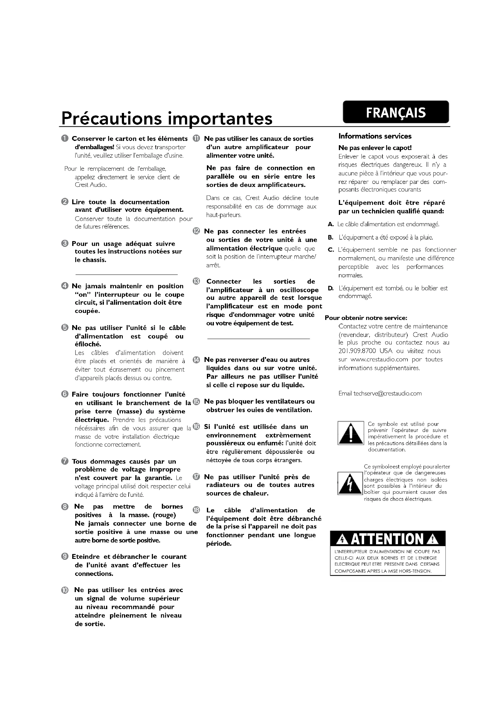 Pour obtenir notre service: Contactez votre centre de maintenance (revendeur, distributeur) Crest Audio le plus proche ou contactez nous au 201.909.8700 USA ou visitez nous sur www.crestaudio.com por toutes informations supplémentaires.Email techserve@crestaudio.comCe symbole est utilisé pour prévenir l’opérateur de suivre impérativement la procédure et les précautions détaillées dans la documentation.Ce symbole est employé pour alerter l’opérateur que de dangereuses charges électriques non isolées sont possibles à l’intérieur du boîtier qui pourraient causer des risques de chocs électriques. Précautions importantes ATTENTION L'INTERRUPTEUR D'ALIMENTAT ION NE COUPE PA S CELLE-CI AUX DEUX BORNES ET DE L'ENERGIE ELECTRIQUE PEUT ETRE PRESENTE DANS CERTAINS COMPOSANTS APRES LA MISE HORS-TENSION. FRANÇAISp. 40 Table des matières