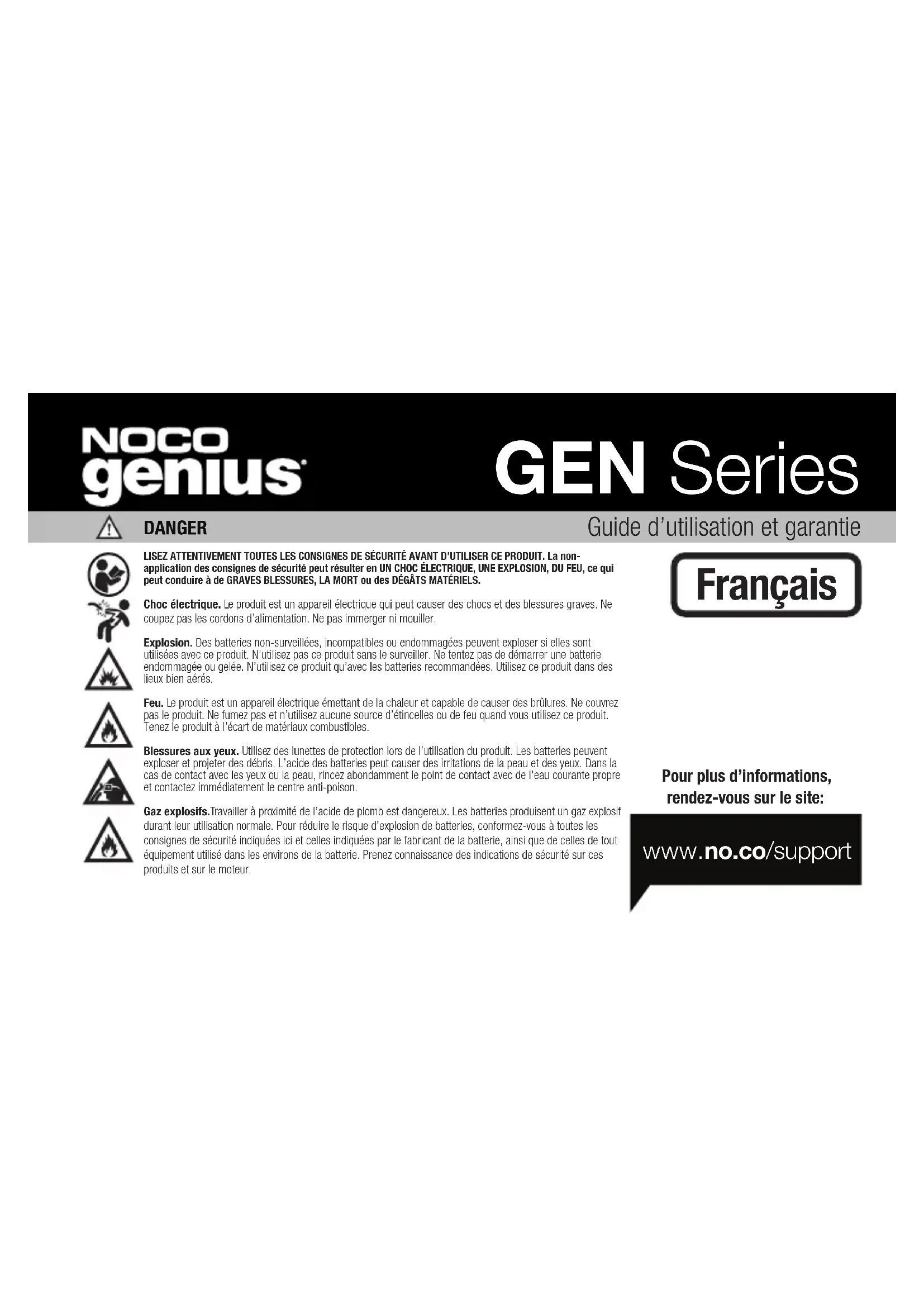 These conditions apply only to Product during the Warranty Period. The Hassle-Free Warranty is void either by elapsed time from date of purchase (elapsed time from serial number date, if no proof of purchase) or from the conditions listed earlier in this document. Return Product with the appropriate documentation. With Receipt: 0-3 Years: NO Charge. With proof of purchase, The warranty period begins on date of purchase. With NO Receipt: 0-3 Years: NO Charge. With NO proof of purchase, The warranty period begins on the serial number date. We recommend registering your NOCO product in order to upload proof of purchase and extend your eective warranty dates. You may register your NOCO product online at: no.co/register. If you have any questions regarding your warranty or product, contact NOCO Support (email and phone number above) or write to: The NOCO Company, at 30339 Diamond Parkway, #102, Glenwillow, OH 44139 USA.Guide d’utilisation et garantie DANGER LISEZ ATTENTIVEMENT TOUTES LES CONSIGNES DE SÉCURITÉ AVANT D’UTILISER CE PRODUIT. La non-application des consignes de sécurité peut résulter en UN CHOC ÉLECTRIQUE, UNE EXPLOSION, DU FEU, ce qui peut conduire à de GRAVES BLESSURES, LA MORT ou des DÉGÂTS MATÉRIELS. Choc électrique. Le produit est un appareil électrique qui peut causer des chocs et des blessures graves. Ne coupez pas les cordons d’alimentation. Ne pas immerger ni mouiller. Explosion. Des batteries non-surveillées, incompatibles ou endommagées peuvent exploser si elles sont utilisées avec ce produit. N’utilisez pas ce produit sans le surveiller. Ne tentez pas de démarrer une batterie endommagée ou gelée. N’utilisez ce produit qu’avec les batteries recommandées. Utilisez ce produit dans des lieux bien aérés. Feu. Le produit est un appareil électrique émettant de la chaleur et capable de causer des brûlures. Ne couvrez pas le produit. Ne fumez pas et n’utilisez aucune source d’étincelles ou de feu quand vous utilisez ce produit. Tenez le produit à l’écart de matériaux combustibles. Blessures aux yeux. Utilisez des lunettes de protection lors de l’utilisation du produit. Les batteries peuvent exploser et projeter des débris. L’acide des batteries peut causer des irritations de la peau et des yeux. Dans la cas de contact avec les yeux ou la peau, rincez abondamment le point de contact avec de l’eau courante propre et contactez immédiatement le centre anti-poison. Gaz explosifs.Travailler à proximité de l’acide de plomb est dangereux. Les batteries produisent un gaz explosif durant leur utilisation normale. Pour réduire le risque d’explosion de batteries, conformez-vous à toutes les consignes de sécurité indiquées ici et celles indiquées par le fabricant de la batterie, ainsi que de celles de tout équipement utilisé dans les environs de la batterie. Prenez connaissance des indications de sécurité sur ces produits et sur le moteur.Pour plus d’informations, rendez-vous sur le site: www.no.co/support Français GEN SeriesÀ propos de GEN Series. Le NOCO GEN Series chargeur de batterie embarqué représente l’une des technologies les plus innovatrices et avancées sur le marché, rendant chaque recharge simple et facile. Il s’agit peut-être du chargeur le plus sécuritaire et efficace que vous utiliserez jamais. La série GEN chargeur de batterie embarqué est conçue pour charger tous les types de batteries au plomb de 12V, y compris les batteries par voie humide (inondées), au gel, MF (sans entretien), CA (calcium), EFB (batteries liquides améliorées) et AGM (Absorbent Glass Mat), en plus des batteries au lithium de 12V (LiFePO4). Adaptée à la charge de batteries d’une capacité maximale de 120ampères-heures et à l’entretien des batteries de toutes dimensions. Premiers pas. Avant d’utiliser le chargeur, veuillez lire attentivement les indications du fabricant et les taux de chargement recommandés pour la batterie. Soyez certains de déterminez le voltage et la composition chimique de la batterie en consultant le guide d’utilisation avant tout chargement. Installation. Il est important de toujours penser à la distance de la batterie. La longueur du câble CC allant du chargeur à la pince ou à l’œillet des bornes de la batterie est d’environ 72 pouces (1828,8mm). Prévoir un jeu de 304mm (12po) entre les connexions. Proposition 65. AVERTISSEMENT: Ce produit peut vous exposer à des agents chimiques, y compris plomb et gaz d’échappement, identifiés par l’État de Californie comme pouvant causer le cancer et des malformations congénitales ou autres effets nocifs sur la reproduction. Pour de plus amples informations, prière de consulter www.P65Warnings. ca.gov. Précaution personnelle. N’utilisez le produit que pour les applications recommandées. Veillez à ce qu’il y ait toujours une personne à portée de voix pour pouvant vous venir en aide en cas d’urgence. Gardez suffisamment d’eau propre avec du savon près de vous en cas de contact avec l’acide de la batterie. Portez une protection des yeux et des vêtements de protection quand vous travaillez près d’une batterie. Lavez-vous toujours les mains après avoir manipulé des batteries et des matériaux correspondants. Ne manipulez pas ou ne portez pas d’objets en métal quand vous utilisez des batteries y compris des outils, des montres ou de bijoux. Si du métal tombe sur une batterie, cela peut causer une étincelle ou un court circuit résultant en un choc électrique, du feu, une explosion pouvant résulter en des blessures, la mort ou des dommages matériels. Mineurs. Si le produit doit être utilisé par un mineur, l’adulte achetant le produit s’engage à expliquer au mineur les instructions de sécurité détaillées et toutes les mises en garde nécessaires avant la première utilisation. Ne pas suivre cette recommandation relève entièrement de la responsabilité de l’acheteur qui accepte d’indemn