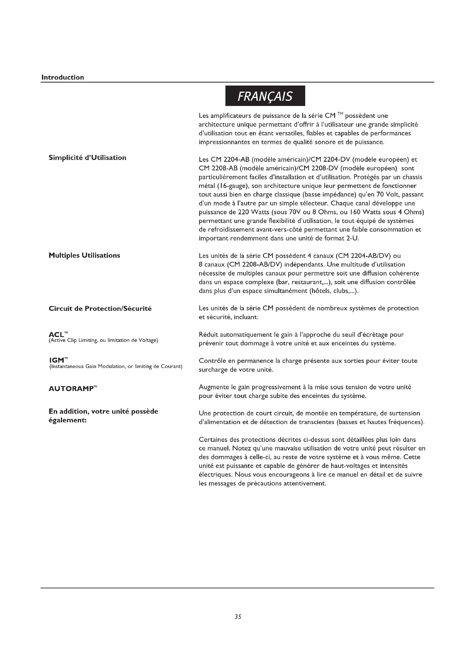 possèdent une architecture unique permettant d’offrir à l’utilisateur une grande simplicité d’utilisation tout en étant versatiles, fiables et capables de performances impressionnantes en termes de qualité sonore et de puissance. Les CM 2204-AB (modèle américain)/CM 2204-DV (modèle européen) et CM 2208-AB (modèle américain)/CM 2208-DV (modèle européen) sont particuliérement faciles d’installation et d’utilisation. Protégés par un chassis métal (16-gauge), son architecture unique leur permettent de fonctionner tout aussi bien en charge classique (basse impédance) qu’en 70 Volt, passant d’un mode à l’autre par un simple sélecteur. Chaque canal développe une puissance de 220 Watts (sous 70V ou 8 Ohms, ou 160 Watts sous 4 Ohms) permettant une grande flexibilité d’utilisation, le tout équipé de systèmes de refroidissement avant-vers-côté permettant une faible consommation et important rendemment dans une unité de format 2-U. Les unités de la série CM possèdent 4 canaux (CM 2204-AB/DV) ou 8 canaux (CM 2208-AB/DV) indépendants. Une multitude d’utilisation nécessite de multiples canaux pour permettre soit une diffusion cohérente dans un espace complexe (bar, restaurant,...), soit une diffusion contrôlée dans plus d’un espace simultanément (hôtels, clubs,...). Les unités de la série CM possèdent de nombreux systèmes de protection et sécurité, incluant: Réduit automatiquement le gain à l’approche du seuil d’écrètage pour prévenir tout dommage à votre unité et aux enceintes du système. Contrôle en permanence la charge présente aux sorties pour éviter toute surcharge de votre unité. Augmente le gain progressivement à la mise sous tension de votre unité pour éviter tout charge subite des enceintes du système. Une protection de court circuit, de montée en température, de surtension d’alimentation et de détection de transcientes (basses et hautes fréquences). Certaines des protections décrites ci-dessus sont détaillées plus loin dans ce manuel. Notez qu’une mauvaise utilisation de votre unité peut résulter en des dommages à celle-ci, au reste de votre système et à vous même. Cette unité est puissante et capable de générer de haut-voltages et intensités électriques. Nous vous encourageons à lire ce manuel en détail et de suivre les messages de précautions attentivement. FRANÇAIS